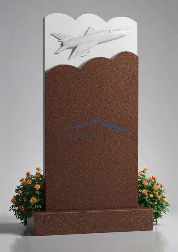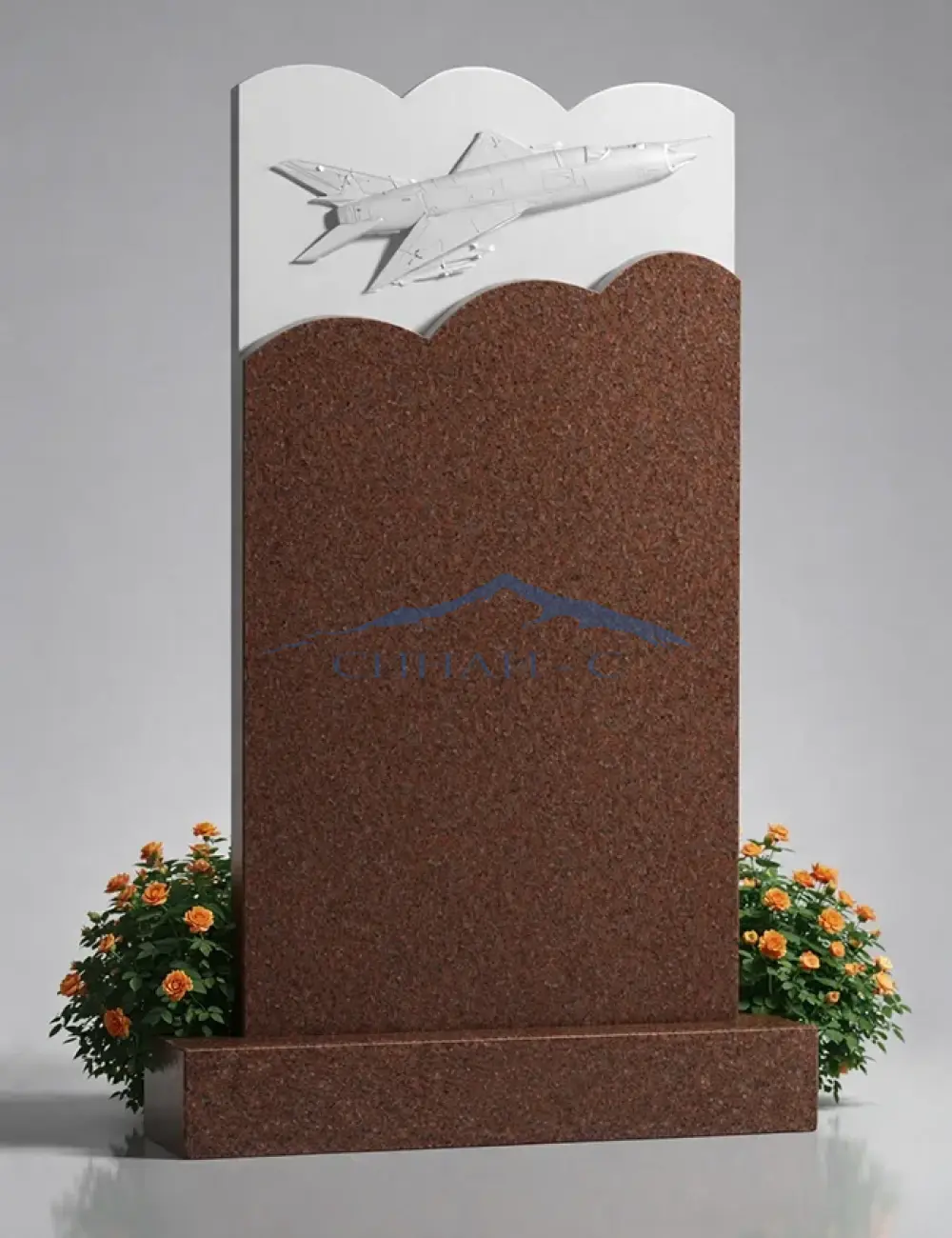 Гранитный памятник с изображением самолета изготовлен из высококачественного красного гранита. Стела имеет классическую прямую форму с мягкой волнообразной верхней линией, придающей композиции завершенность и выразительность. В верхней части размещен художественный барельеф самолета, символизирующий полет, свободу, память о профессии или жизненном пути человека. Такие элементы часто используются для увековечения памяти летчиков и людей, связанных с авиацией. Контраст теплого оттенка гранита и светлого декоративного элемента подчеркивает глубину композиции. Памятник отличается лаконичным и тематическим дизайном. Возможна гравировка имен, дат или изображений для индивидуального оформления.