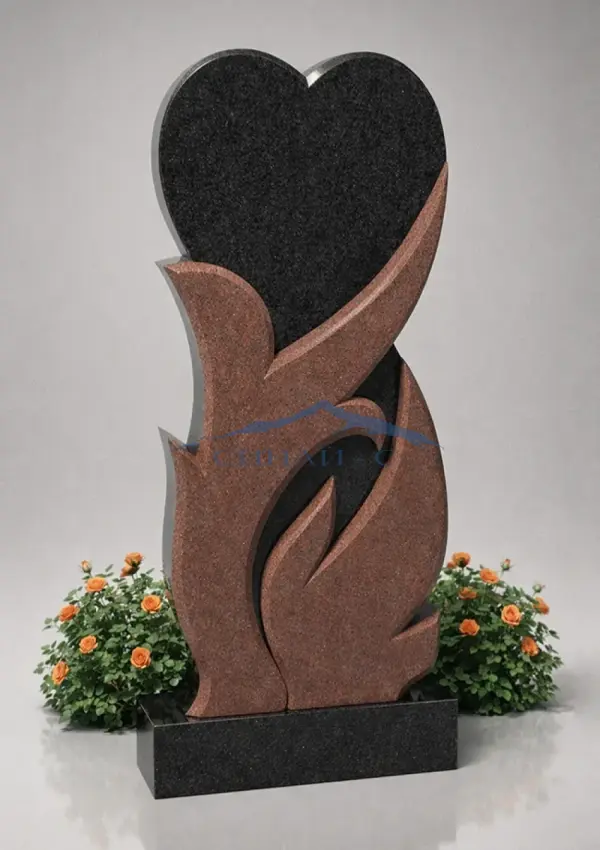 Гранитный памятник в форме сердца изготовлен из сочетания черного и красного гранита высокого качества. Оригинальная композиция объединяет два контрастных элемента, символизируя единство, любовь и вечную память. Фигурная форма стелы плавно переходит в декоративные линии, создавая ощущение движения и гармонии. Контраст темного и теплого оттенка гранита подчеркивает глубину и выразительность памятника, придавая ему современный и запоминающийся вид. Лаконичный, но эмоционально насыщенный дизайн делает изделие особенным мемориальным решением. Возможна гравировка имен, дат или изображений для индивидуального оформления.
