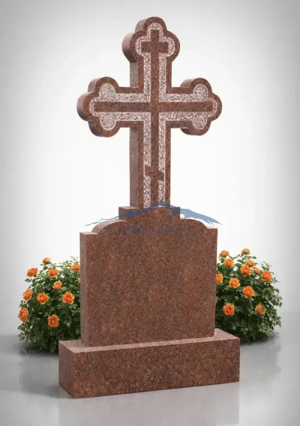 Гранитный памятник с крестом изготовлен из прочного красного гранита, отличающегося выразительной природной текстурой. Крест выполнен с аккуратной геометрической резьбой и контурным оформлением, что придаёт композиции четкость и гармонию. Символ креста олицетворяет веру, духовную защиту и вечную память о близком человеке. Контраст между фактурной поверхностью камня и светлой внутренней отделкой подчеркивает глубину рисунка и делает памятник более выразительным. Возможна гравировка, которая позволяет персонализировать памятник именами, датами или изображениями.