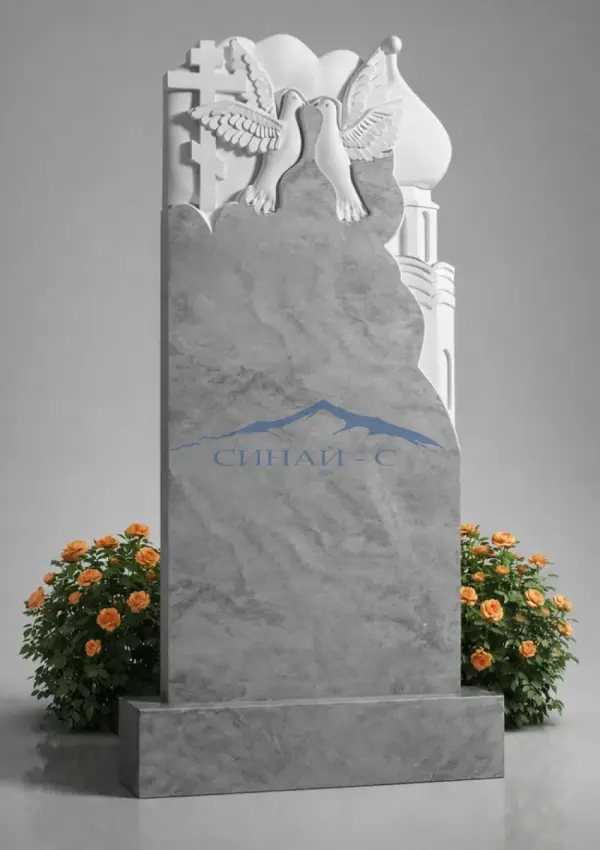 Мраморный памятник с крестом и голубями выполнен из натурального светлого мрамора, придающего изделию выразительный и благородный вид. Скульптурное изображение пары голубей с расправленными крыльями символизирует чистоту души, любовь и вечную верность, а также духовную связь и надежду на небесный покой. Православный крест подчеркивает веру и вечную жизнь, усиливая религиозный смысл композиции. Плавные формы и архитектурные элементы создают гармоничный и торжественный образ. Такой памятник передает глубокие чувства любви и памяти. Возможна гравировка имен, дат или изображений для создания индивидуального мемориального оформления.