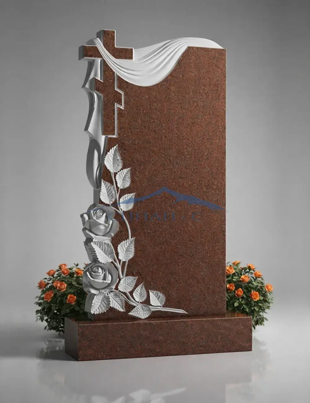 Гранитный памятник с крестом, драпировкой и розами изготовлен из высококачественного красного гранита. Прямая форма стелы придает изделию строгость и монументальность. В верхней части расположен православный крест, дополненный художественной резьбой в виде ниспадающей ткани, символизирующей скорбь, прощание и вечную память. Нижняя часть украшена изящным цветочным орнаментом с розами и листьями, выполненными с тонкой детализацией, олицетворяющими любовь и уважение к ушедшему человеку. Контраст теплого оттенка гранита и светлого рельефа подчеркивает выразительность композиции. Возможна гравировка имен, дат или изображений для индивидуального оформления.