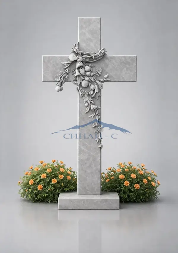 Мраморный памятник в форме креста с декоративной композицией выполнен из натурального светлого мрамора, придающего изделию благородный и выразительный вид. Крест украшен художественной резьбой с элементами цветов и тернового венка, символизирующего страдание, память и духовное очищение. Изящные растительные мотивы подчеркивают любовь, уважение и светлую память о близком человеке. Четкая геометрия формы сочетается с мягкими линиями декора, создавая гармоничный и глубокий по смыслу образ. Такой памятник отражает веру, скорбь и надежду на вечную жизнь. Возможна гравировка имен, дат или изображений для создания индивидуального мемориального оформления.