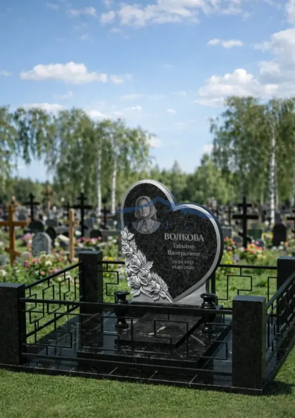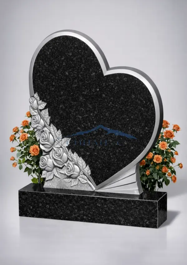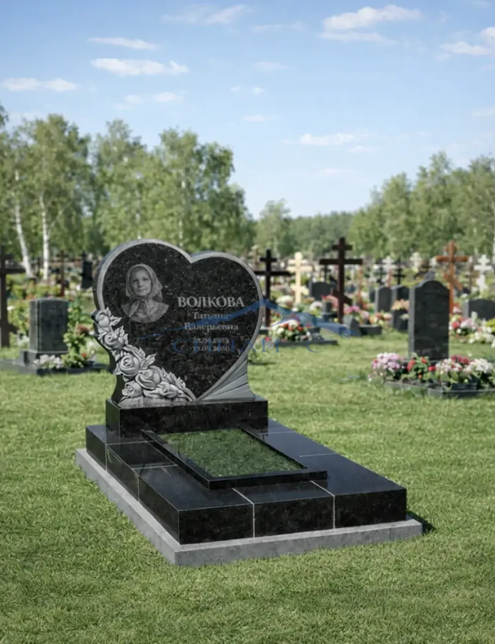 Гранитный памятник с эффектным дизайном в виде сердца и роз в нижней части — это стильное и трогательное изделие. Он выполнен из классического чёрного гранита, который акцентирует внимание на изысканной резьбе — нежных розах, олицетворяющих память о любимом человеке. Верхняя часть имеет округлую форму с плавными линиями, что придаёт композиции элегантность и гармонию. В комплект входит гранитная стела с оригинальной резкой по граниту, с пятисторонней полировкой и гранитная тумба .
