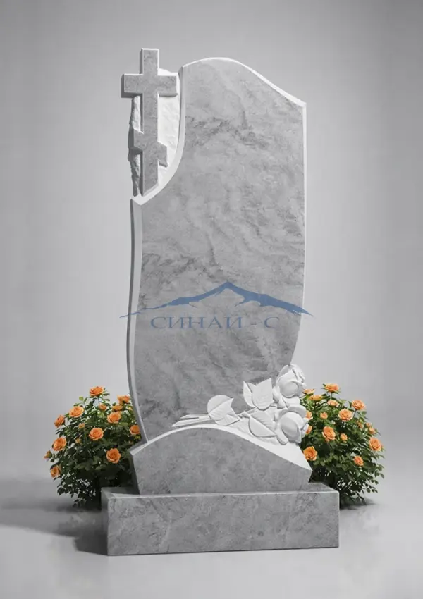 Мраморный памятник с крестом и розами выполнен из светлого натурального мрамора и отличается изящной фигурной формой. Православный крест в верхней части символизирует веру, духовную защиту и вечную память о близком человеке. Резная композиция из роз в нижней части передаёт чувства любви, скорби и уважения, подчеркивая значимость утраты. Плавные линии и сочетание гладкой поверхности с декоративными элементами создают гармоничный и благородный образ. Стела подходит для нанесения гравировки с именами, датами и изображениями, позволяя создать индивидуальный мемориал, отражающий светлую память о близком.