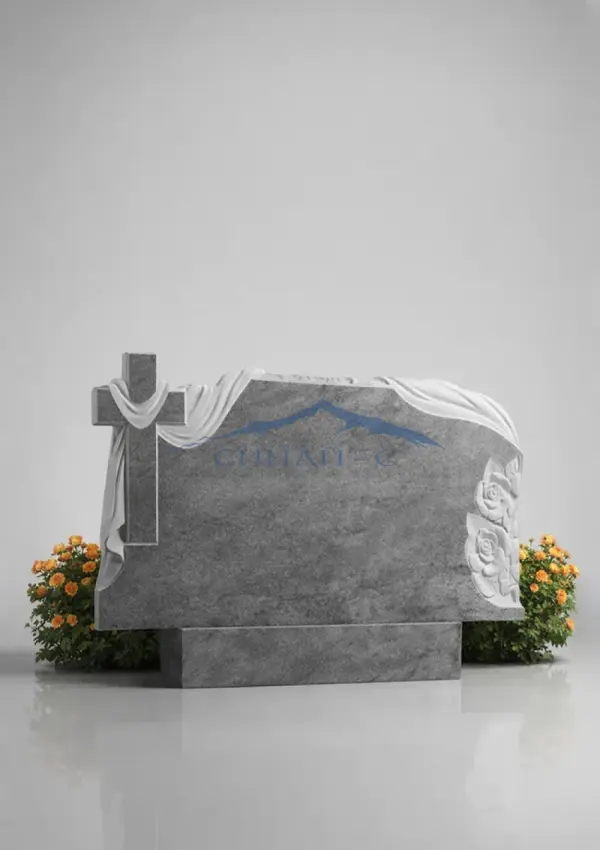 Мраморный горизонтальный памятник с крестом и розами выполнен из натурального светлого мрамора, придающего изделию благородный и сдержанный вид. Декоративная драпировка в верхней части символизирует скорбь и память, а крест олицетворяет веру, надежду и вечную жизнь. Рельефные розы, выполненные с высокой детализацией, выражают любовь, уважение и светлую память о близком человеке, подчеркивая эмоциональную глубину композиции. Плавная форма стелы создает гармоничный и спокойный образ. Возможна гравировка имен, дат или изображений, что позволяет создать индивидуальный мемориальный памятник.