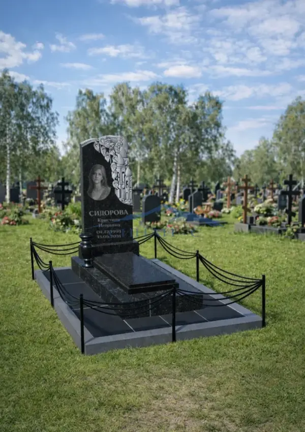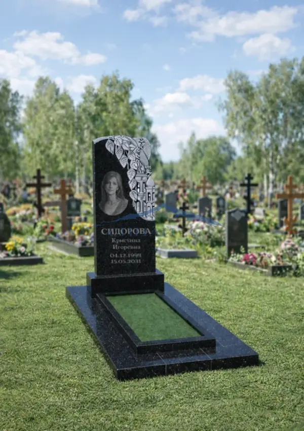 Гранитный памятник «Веточка 3» изготовлен из прочного чёрного гранита и выполнен в строгой вертикальной форме. Верхняя часть стелы украшена резной ветвью с детально проработанными листьями и барельефом православного храма с куполами и крестами. Светлые элементы выразительно выделяются на полированной поверхности камня, создавая гармоничную композицию. Модель сочетает природную символику и духовный смысл. Предусмотрена гравировка портрета, имён и памятных дат. В комплект входит вертикальная резная стела с оригинальными мотивами с двухсторонней полировкой и гранитная тумба.