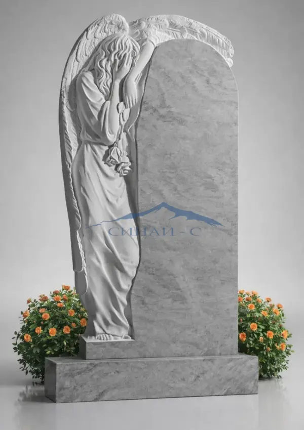 Мраморный памятник с ангелом выполнен из светлого натурального мрамора и отличается выразительной художественной композицией. Фигура скорбящего ангела, склонившегося к стеле и держащего розу, символизирует глубокую печаль, любовь и вечную память о близком человеке. Образ ангела традиционно олицетворяет защиту души и её переход в иной мир, создавая ощущение духовного покоя и надежды. Детальная проработка крыльев и складок одежды придаёт скульптуре реалистичность и эмоциональную глубину. Плавная форма стелы гармонично дополняет композицию, а поверхность подходит для нанесения гравировки с именами и датами, позволяя создать индивидуальный мемориал.