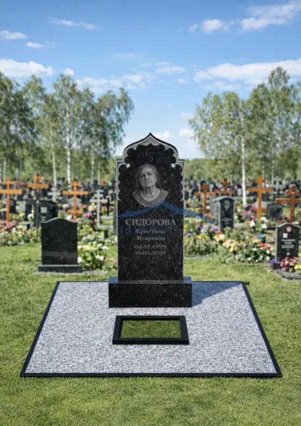 Этот гранитный памятник выполнен из высококачественного черного гранита с элегантным арочным завершением. Он имеет строгие и лаконичные линии, при этом верхняя часть украшена плавно изогнутыми элементами, что придает изделию утонченную форму. . Шариатом предписывается, чтобы все памятники правоверных были строгими и сдержанными в оформлении.