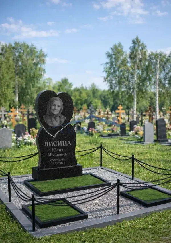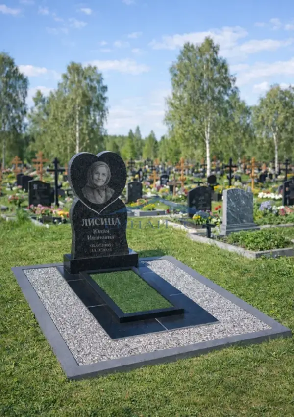 Гранитный памятник «Некрополь» выполнен в выразительной фигурной форме с верхней частью в виде сердца из прочного чёрного гранита. Плавные линии силуэта создают гармоничную и аккуратную композицию, символизирующую любовь и память. Полированная поверхность подчёркивает глубину цвета и качество обработки камня. Модель подходит для двойного захоронения и позволяет разместить портреты, имена, даты и памятные надписи. Возможна индивидуальная гравировка по желанию заказчика.