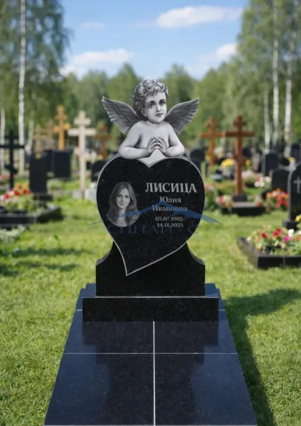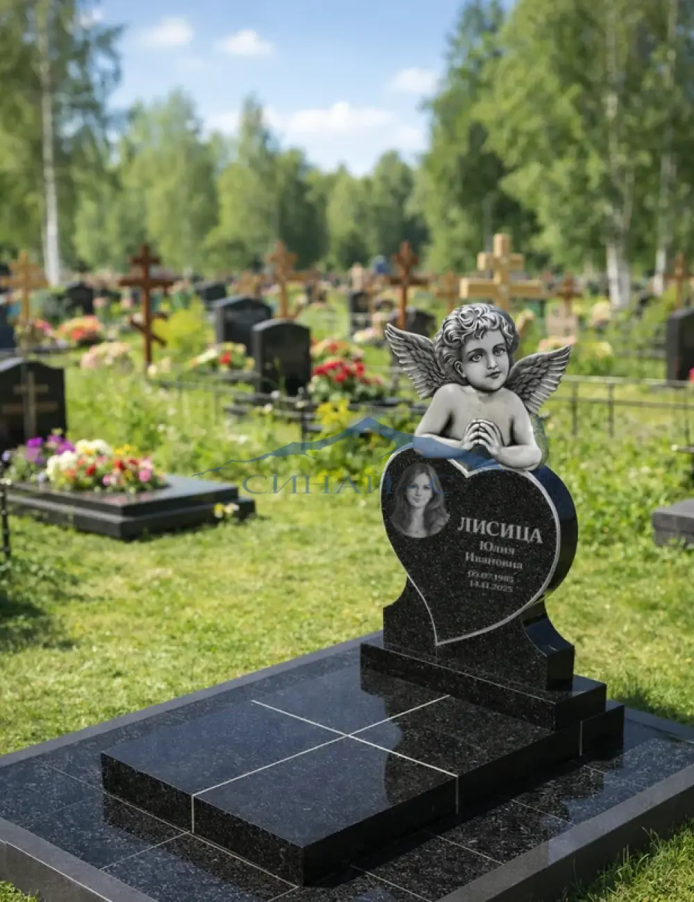 Гранитный памятник «Ангел» выполнен из высококачественного черного гранита, отличающегося прочностью и стойкостью к атмосферным воздействиям. Верхнюю часть украшает художественно выполненная фигура ангела, изображённого с крыльями и сложенными руками, что символизирует заботу, защиту и вечную память о близком человеке. Сердцевидная форма стелы придаёт памятнику мягкость и глубину эмоций, подчеркивая светлую связь с усопшим. Каждый художественный элемент вырезан с высокой степенью детализации, а отшлифованная поверхность создает благородный визуальный эффект. Возможна персонализированная гравировка имен, дат и надписей, что делает памятник уникальным и отражающим память о родном человеке.