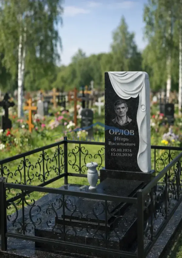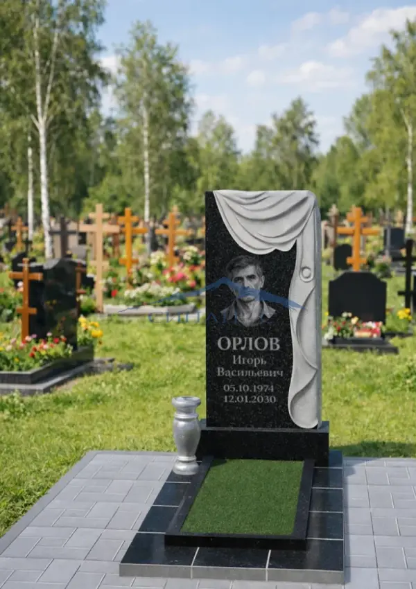 Гранитный памятник «Погас твой взор» выполнен из высококачественного черного гранита, который отличается прочностью, долговечностью и устойчивостью к атмосферным воздействиям. Стела имеет строгую прямоугольную форму, украшенную художественным элементом в виде изящной драпировки и плавного декоративного орнамента, символизирующего светлую память, скорбь и уважение к ушедшему человеку. Контраст полированной поверхности гранита и рельефной резьбы придаёт памятнику выразительность и торжественность. Гладкая лицевая часть идеально подходит для нанесения портрета, имён, дат и памятных надписей, сохраняя память о близком человеке на долгие годы. Памятник гармонично смотрится на одиночном захоронении и может стать частью мемориального комплекса. Возможна индивидуальная гравировка с именами, датами и символами памяти.