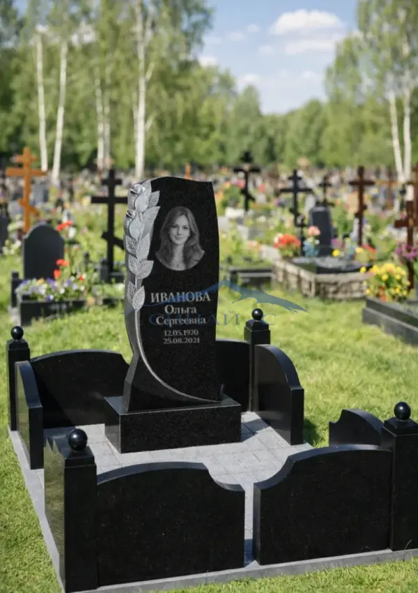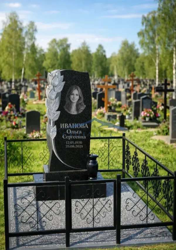 Гранитный памятник «Погасла ясная звезда» выполнен из прочного черного гранита высокого качества, который отличается долговечностью, устойчивостью к атмосферным воздействиям и благородной природной текстурой. Фигурная стела с плавными линиями украшена художественным барельефом роз, символизирующих любовь, светлую память и глубокое уважение к ушедшему человеку. Изящная композиция сочетает строгую форму камня и декоративный цветочный элемент, создавая гармоничный и выразительный образ. Полированная поверхность памятника идеально подходит для нанесения портрета, имён, дат и памятных надписей, позволяя сохранить память о близком человеке на долгие годы. Такая модель гармонично смотрится как на одиночных захоронениях, так и в составе мемориального комплекса. Возможна индивидуальная гравировка с именами, датами и символами, что делает памятник уникальным выражением любви, скорби и вечной памяти.