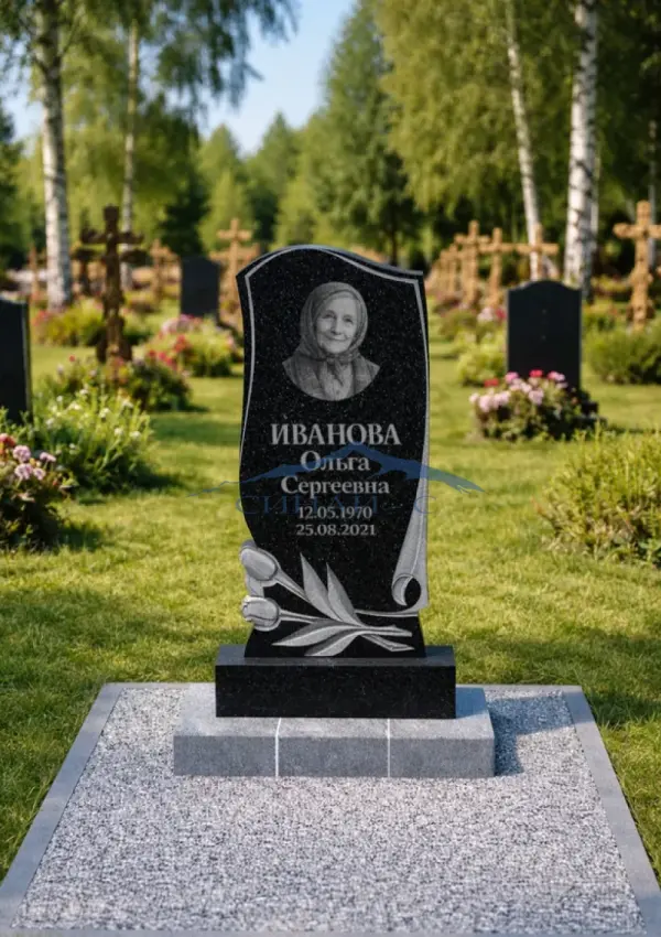 Гранитный памятник «Разлука» изготовлен из высококачественного черного гранита, который отличается высокой прочностью, устойчивостью к атмосферным воздействиям и благородной природной текстурой. Фигурная стела с мягкими изогнутыми линиями дополнена декоративным барельефом тюльпанов и изящным элементом в виде свитка, символизирующим память, любовь и светлую печаль разлуки. Художественная композиция придаёт памятнику особую выразительность и гармонию, создавая трогательный и уважительный образ. Полированная поверхность камня идеально подходит для нанесения портрета, имён, дат и памятных надписей, позволяя сохранить память о близком человеке на долгие годы. Памятник гармонично смотрится на одиночном захоронении и может стать частью мемориального комплекса. Возможна индивидуальная гравировка с именами, датами и памятными символами, что делает изделие уникальным выражением любви и вечной памяти.