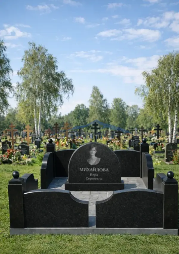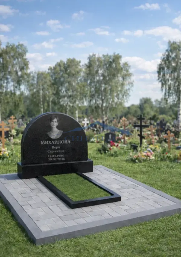 Гранитный памятник «Арка горизонтальная» выполнен из чёрного гранита в классической горизонтальной форме. Верхняя часть стелы имеет плавное арочное завершение, которое придаёт памятнику строгий и гармоничный внешний вид. Полированная поверхность камня обеспечивает чёткое нанесение гравировки — портретов, фамилии, имени, дат жизни и памятных надписей. Такая форма хорошо подходит для оформления семейного захоронения и позволяет разместить информацию о двух людях. Купить гранитный памятник «Арка горизонтальная» можно в Саратове и Энгельсе с изготовлением и установкой.