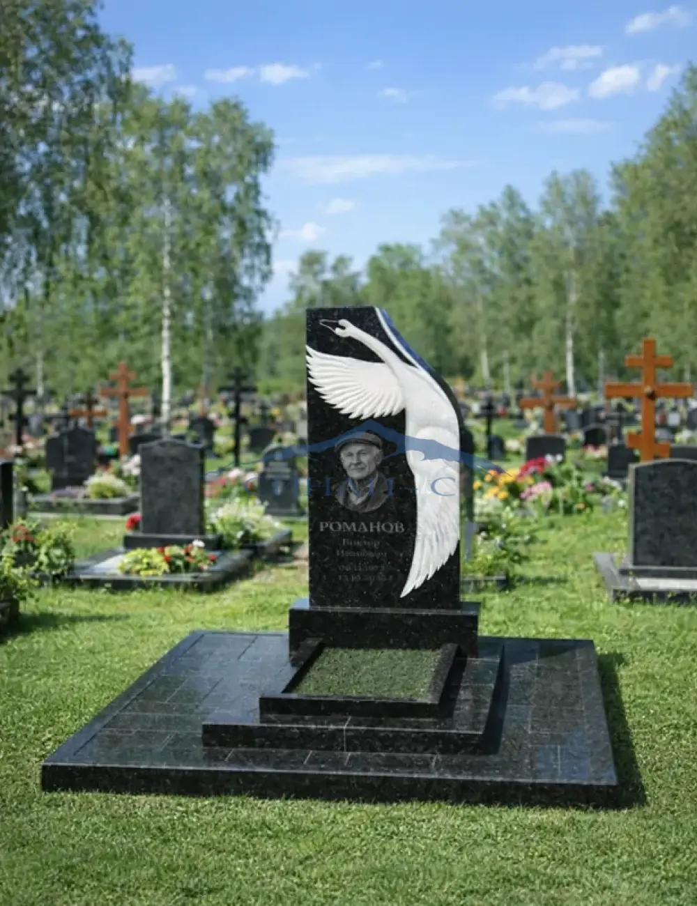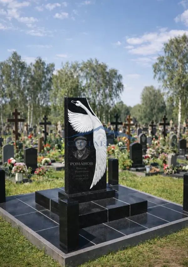 Гранитный памятник с изображением лебедя с расправленными крыльями выполнен с особым вниманием к деталям. Этот элегантный памятник сочетает в себе символику вечной любви и нежности. Лебедь, с высокой художественной выразительностью, сидит с раскрытыми крыльями, что добавляет композиции лёгкости и величия. Сердце, выполненное в виде гладкой черной поверхности, может быть персонализировано с помощью гравировки, например, с именем и датами. Изысканная резьба и плавные линии делают этот памятник не только местом памяти, но и символом гармонии и покоя. Памятник выполнен из высококачественного черного гранита, что гарантирует долговечность и стойкость к времени.