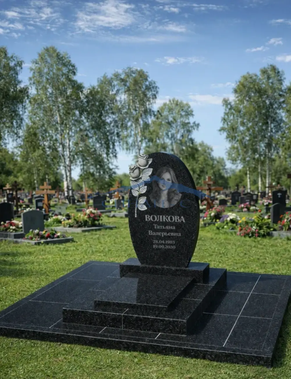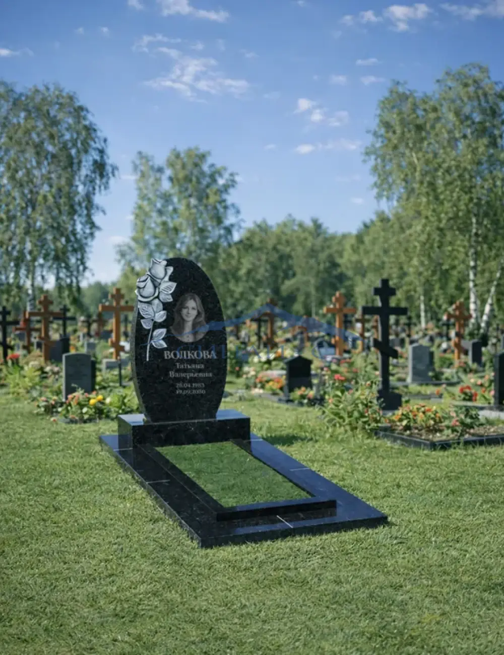 Гранитный памятник выполнен в элегантной овальной форме, что придаёт композиции мягкость и завершённость линий. Верхняя часть стелы украшена изящным изображением двух роз с листьями, расположенных в левой зоне, создавая аккуратный декоративный акцент. Контраст светлого оформления и тёмной полированной поверхности подчёркивает глубину цвета и чёткость деталей. Памятник установлен на прочное прямоугольное основание, обеспечивающее устойчивость конструкции. Просторная лицевая часть позволяет разместить портрет, имена, даты и памятные слова, сохраняя гармоничный и утончённый внешний вид.