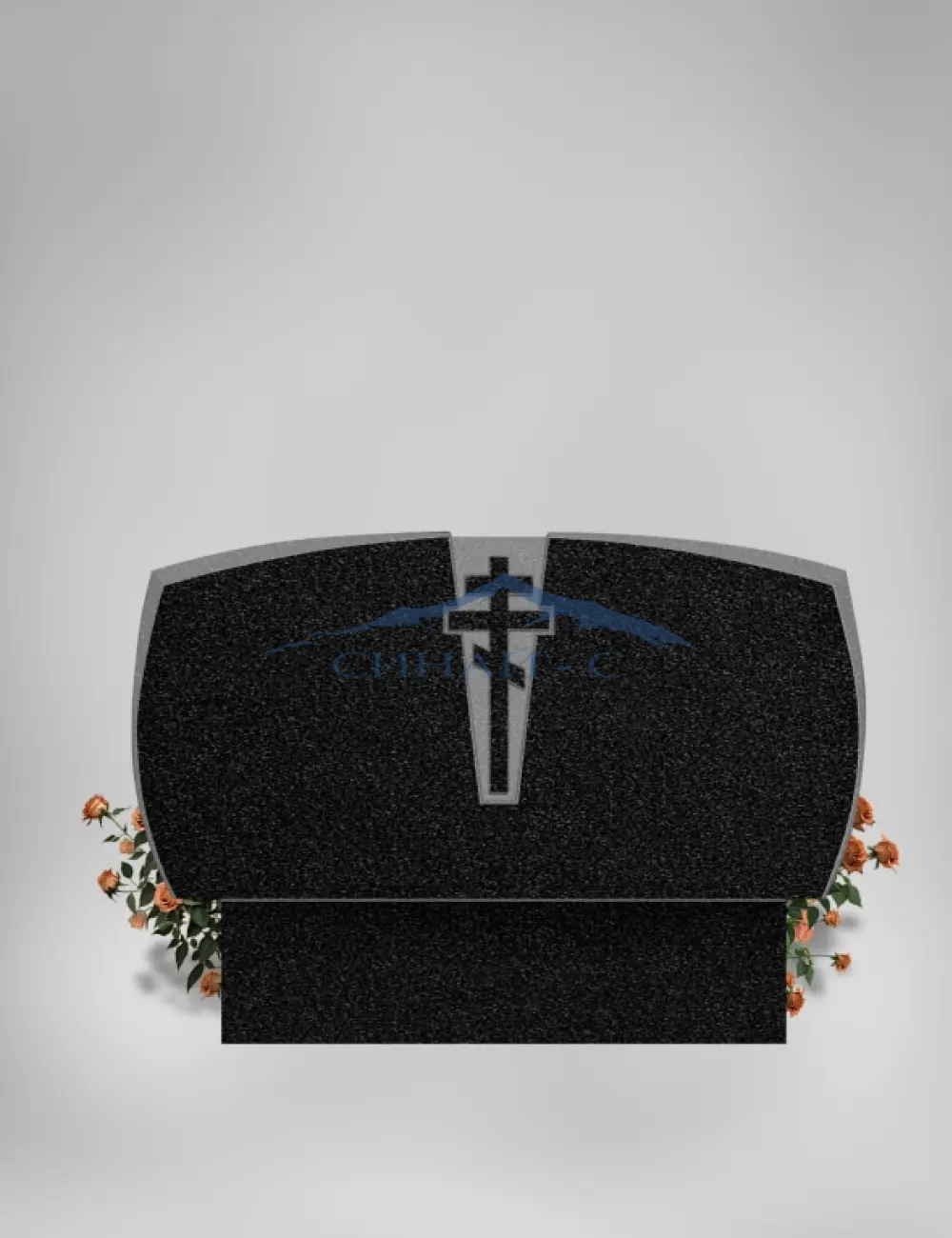 Гранитный памятник «Крест в центре» выполнен в горизонтальной форме из чёрного полированного гранита. Центральную часть композиции выделяет светлая вставка со стилизованным православным крестом, создающая выразительный визуальный акцент. Плавная линия верха придаёт стеле гармоничный силуэт и подчёркивает строгий характер модели. Просторная лицевая поверхность предназначена для размещения портретов, имён и памятных дат. Подходит для двойного захоронения. Возможна индивидуальная гравировка.