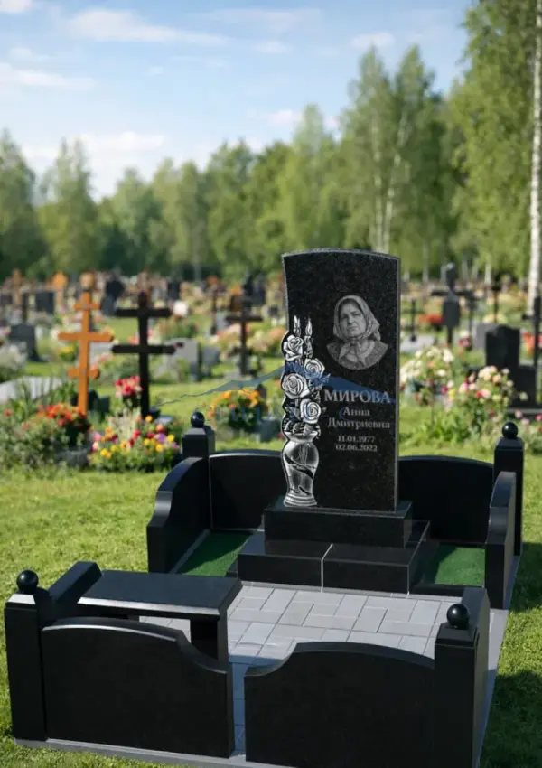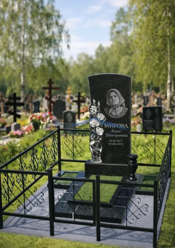 Гранитный памятник «Розы в вазе» выполнен из чёрного гранита и украшен художественным декоративным элементом из светлого камня. С левой стороны стелы расположена объёмная композиция в виде вазы с розами, выполненная в контрастном светлом граните. Такой элемент придаёт памятнику выразительность и символизирует любовь, память и уважение к ушедшему человеку. Полированная поверхность чёрного гранита идеально подходит для нанесения гравировки портрета, фамилии, имени, дат жизни и памятной надписи. Купить гранитный памятник «Розы в вазе» можно в Саратове и Энгельсе с изготовлением и установкой.