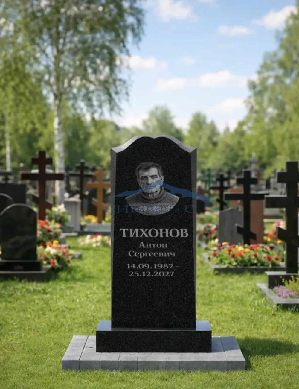 Гранитный памятник «В безмерный час» выполнен из прочного натурального гранита и отличается строгой классической формой с плавным фигурным завершением. Лаконичный дизайн стелы подчеркивает благородство камня и создаёт сдержанный, достойный образ мемориала, символизирующий вечную память и уважение к ушедшему человеку. Полированная поверхность гранита красиво раскрывает природную текстуру камня и идеально подходит для нанесения портрета, имени, дат жизни и памятной эпитафии.