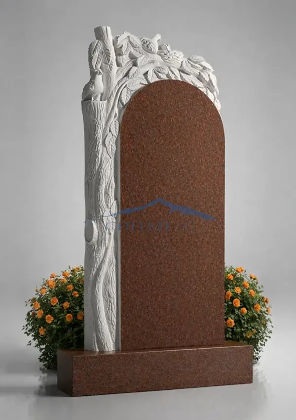 Гранитный памятник с художественным оформлением выполнен из прочного красного гранита с выразительной природной текстурой. Стела дополнена объемной резьбой в виде дерева с птицами, символизирующими жизнь, светлую память и связь поколений. Детальная проработка коры, листьев и фигур птиц придает композиции глубину и реалистичность. Контраст между гладкой поверхностью основной части и скульптурными элементами усиливает визуальное восприятие памятника. Гармоничная форма и природные мотивы создают спокойный и светлый образ. Возможна гравировка, позволяющая персонализировать памятник именами, датами или изображениями.