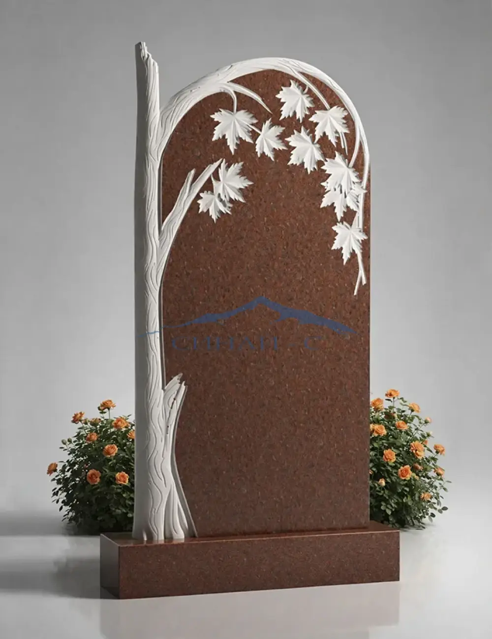 Гранитный памятник с деревом и листьями изготовлен из высококачественного красного гранита. Арочная форма стелы придает изделию мягкость и гармонию, создавая спокойный и выразительный образ. Левая часть оформлена в виде ствола дерева с художественной резьбой, переходящего в ветви с листьями, выполненными с тонкой детализацией. Декоративный орнамент символизирует жизнь, связь поколений и вечную память. Контраст теплого оттенка гранита и светлого резного элемента подчеркивает глубину композиции и делает памятник визуально выразительным. Возможна гравировка имен, дат или изображений для индивидуального оформления.