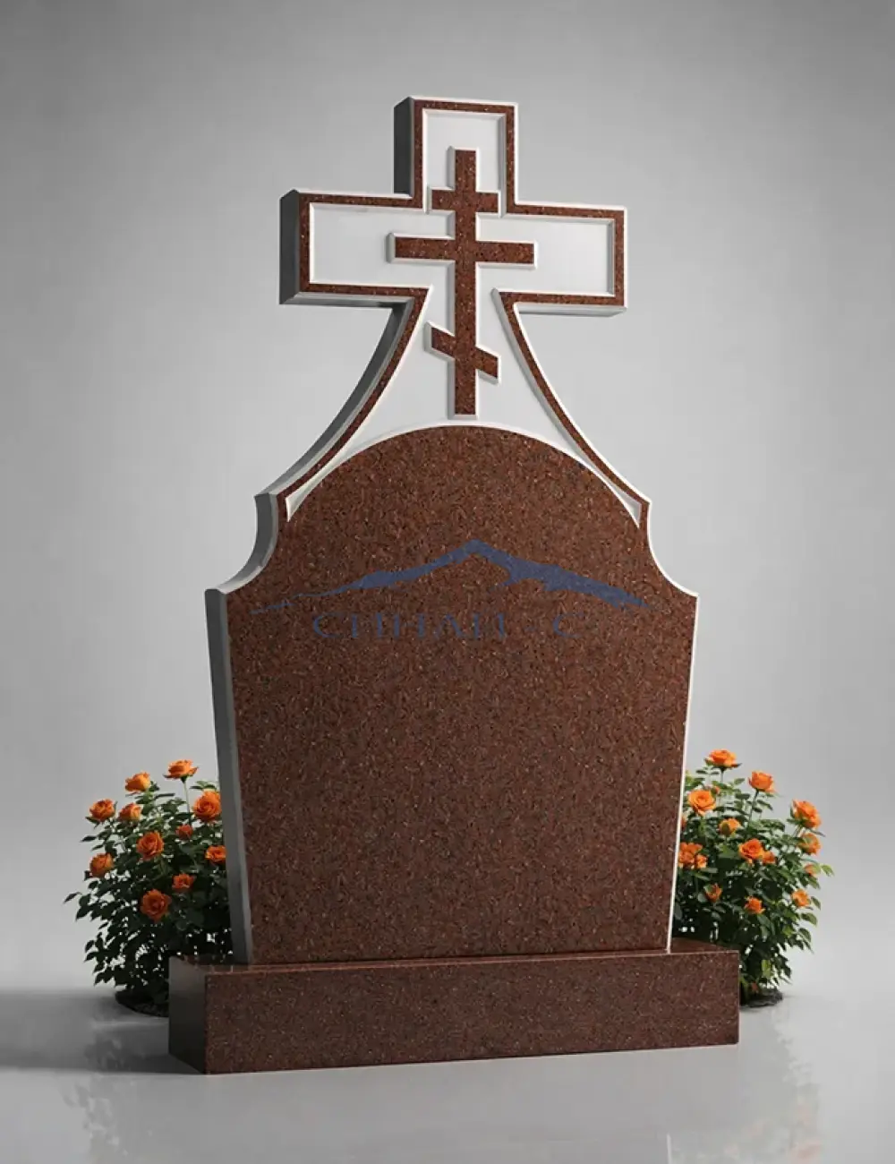 Гранитный памятник с православным крестом выполнен из прочного красного гранита с выразительной природной текстурой. Композиция дополнена светлыми декоративными вставками, которые подчеркивают форму креста и придают памятнику выразительность и глубину. Крест символизирует веру, духовную защиту и вечную память о близком человеке. Плавные линии стелы гармонично сочетаются с геометрией креста, создавая строгий и благородный образ. Контраст материалов усиливает визуальный эффект и делает памятник более заметным. Возможна гравировка, позволяющая персонализировать памятник именами, датами или изображениями.
