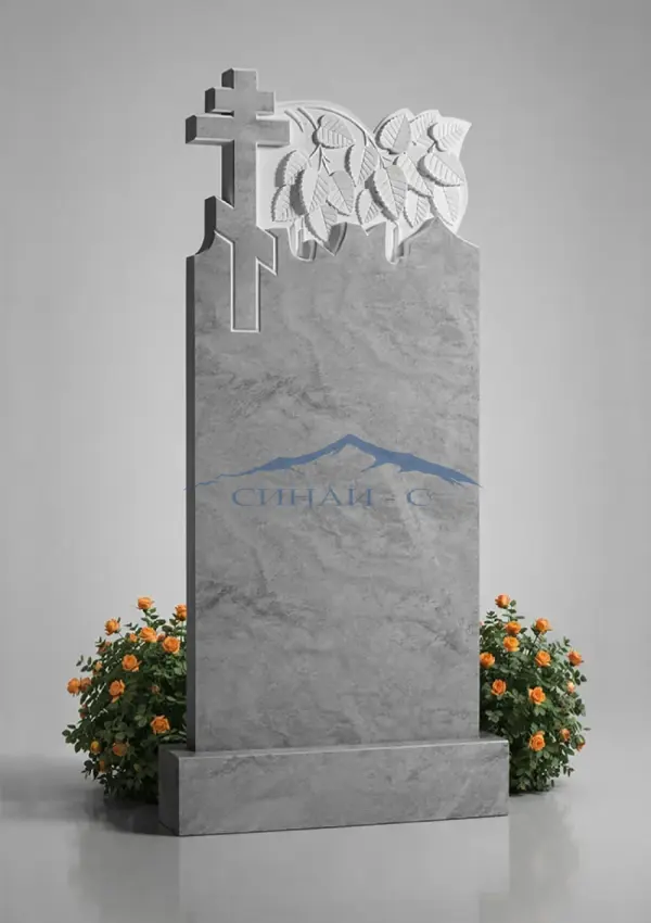 Мраморный памятник с крестом и декоративной резьбой выполнен из светлого натурального мрамора и отличается строгой и одновременно выразительной композицией. Православный крест в верхней части символизирует веру, надежду на вечную жизнь и духовную связь с ушедшим человеком. Резной орнамент в виде листьев придает памятнику мягкость и природную гармонию, подчеркивая светлую память и уважение. Плавная форма стелы и сочетание гладкой поверхности с художественными элементами создают аккуратный и благородный внешний вид. Стела подходит для нанесения гравировки с именами, датами и изображениями, позволяя создать индивидуальный мемориал.