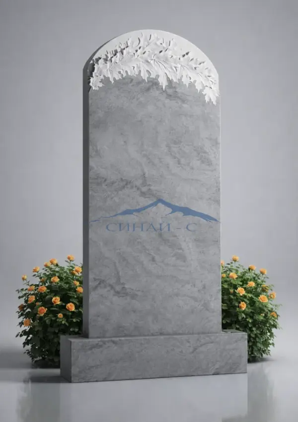 Мраморный памятник выполнен из светлого натурального мрамора с мягкой природной текстурой, подчеркивающей его благородство и утонченность. Классическая форма стелы с закругленным верхом дополнена художественной резьбой в виде листьев в верхней части, создающей выразительный декоративный акцент. Растительный орнамент символизирует вечную память, жизненный цикл и силу духа. Плавные линии и аккуратная обработка придают памятнику гармоничный и спокойный вид. Поверхность мрамора идеально подходит для нанесения гравировки с именами, датами или изображениями, позволяя создать индивидуальный и достойный мемориал.