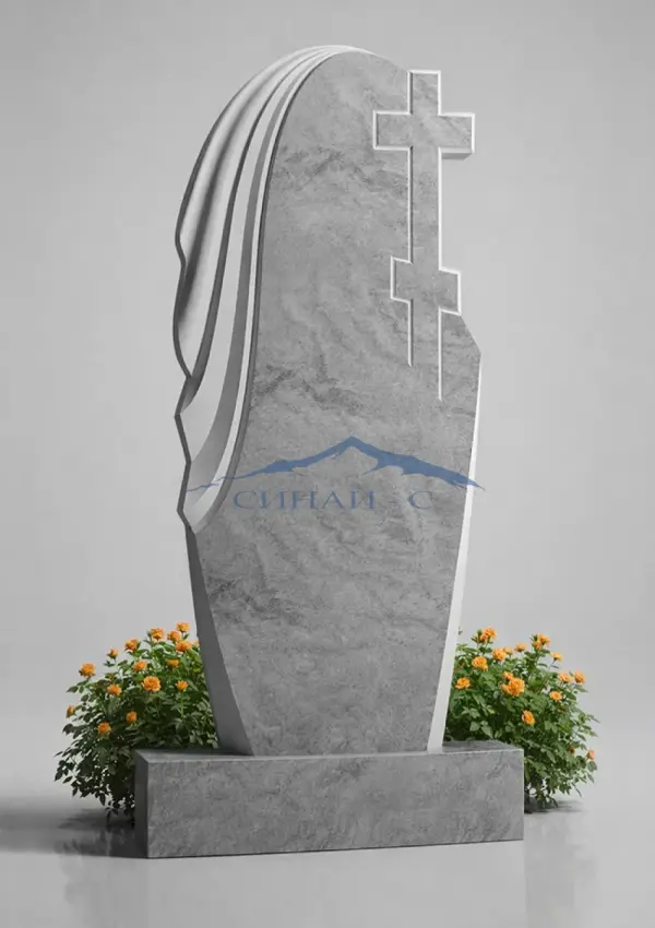 Мраморный памятник с православным крестом выполнен из натурального светлого мрамора, отличающегося благородной текстурой и эстетичной поверхностью. Рельефный крест символизирует веру, духовную защиту и вечную память об ушедшем человеке. Плавные линии стелы и изящный драпированный элемент сбоку создают ощущение мягкости и гармонии, придавая композиции утончённый и современный вид. Сочетание строгой формы и декоративных деталей делает памятник выразительным и достойным. Возможна гравировка, позволяющая нанести имена, даты или изображения, создавая индивидуальное мемориальное оформление.
