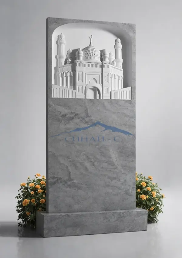 Мраморный памятник с рельефным изображением мечети выполнен из натурального светлого мрамора, придающего изделию благородный и выразительный вид. Детализированная композиция с куполами и минаретами, увенчанными полумесяцем, символизирует веру, духовность и принадлежность к исламской культуре. Архитектурный рельеф выполнен с высокой точностью, что придаёт памятнику глубину и художественную выразительность. Строгая форма стелы гармонично сочетается с декоративным элементом, создавая сдержанный и достойный образ. Возможна гравировка имен и дат, позволяющая создать индивидуальный памятный знак с учетом религиозных традиций.