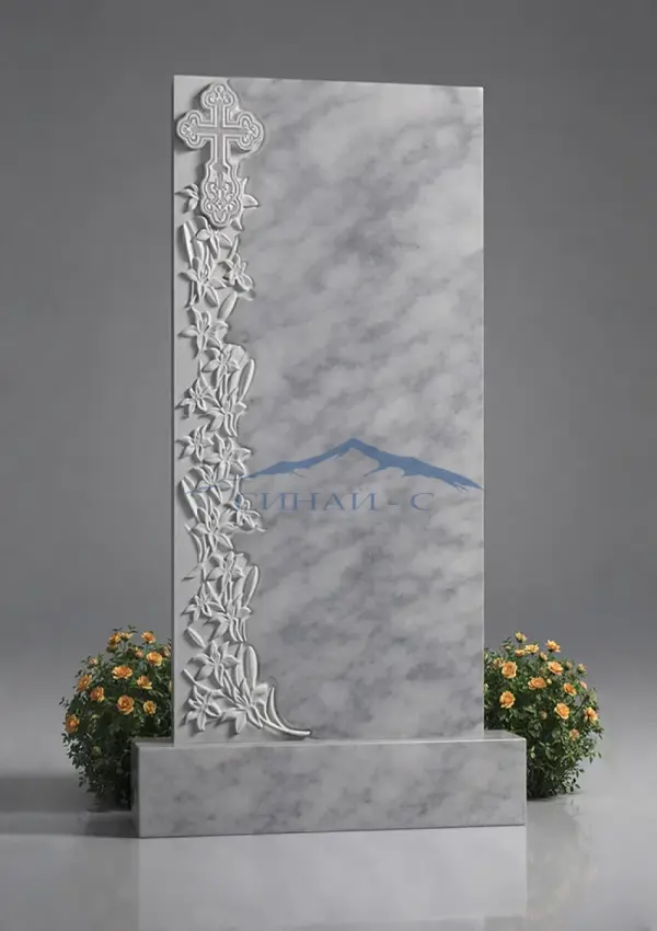 Мраморный памятник с крестом и цветочным орнаментом выполнен из натурального светлого мрамора, придающего изделию утончённый и благородный вид. Рельефный крест в верхней части символизирует веру, надежду и вечную жизнь, а изящная вертикальная композиция с цветами, выполненная с высокой детализацией, олицетворяет любовь, скорбь и светлую память о близком человеке. Плавные линии и художественная резьба создают гармоничный и выразительный образ. Лаконичная форма стелы делает памятник универсальным и эстетичным решением. Возможна гравировка имен, дат или изображений, что позволяет создать индивидуальный памятный знак.