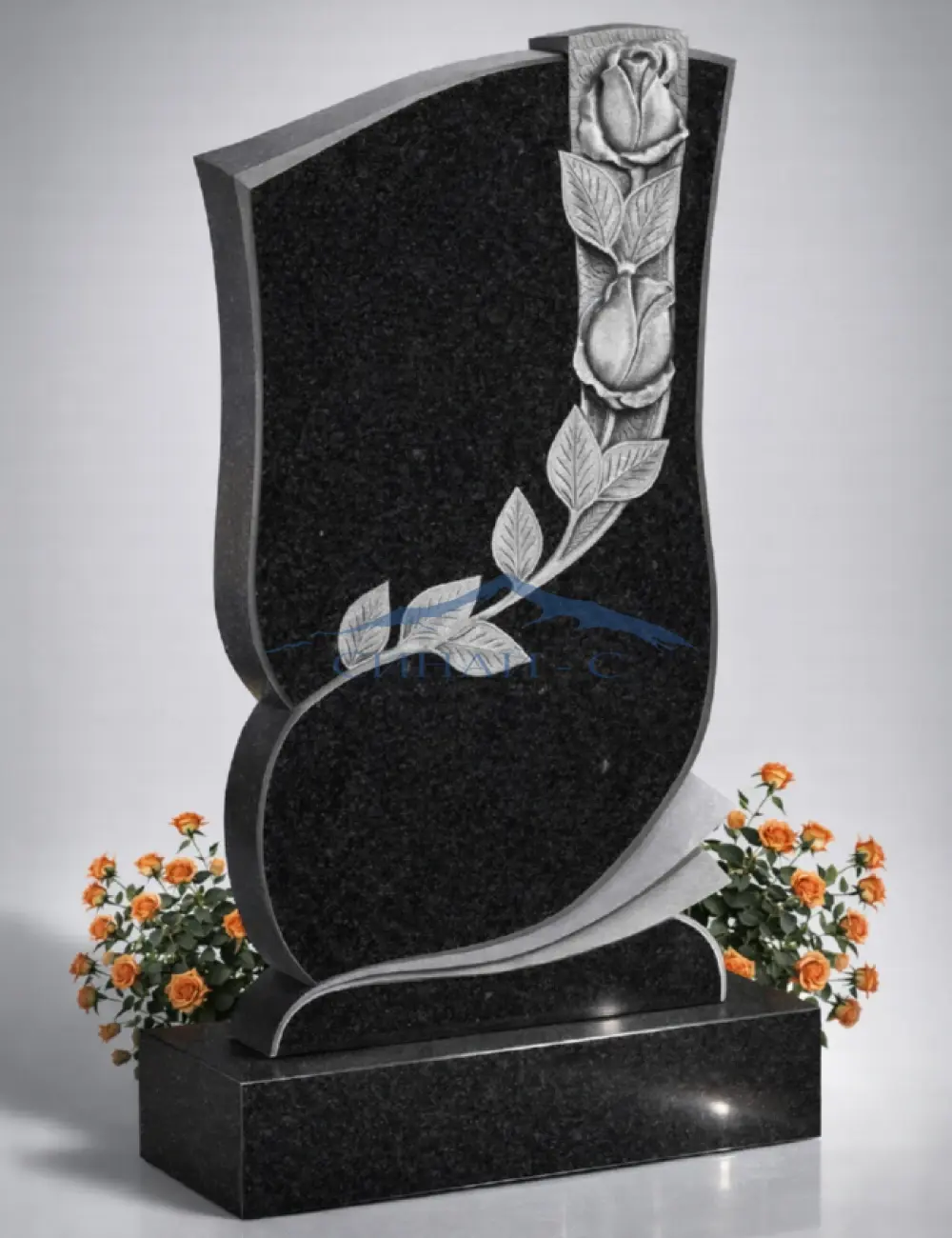 Гранитный памятник с розой выполнен в изящной волнообразной форме из прочного чёрного гранита. Фигурная стела украшена резной ветвью розы, расположенной вдоль боковой части композиции. Детально проработанные лепестки и листья создают выразительный контраст с полированной поверхностью камня. Плавные линии подчёркивают утончённость модели и придают памятнику особую гармонию. Возможна гравировка портрета, надписей и дат, что позволяет создать индивидуальный мемориал.