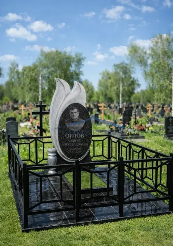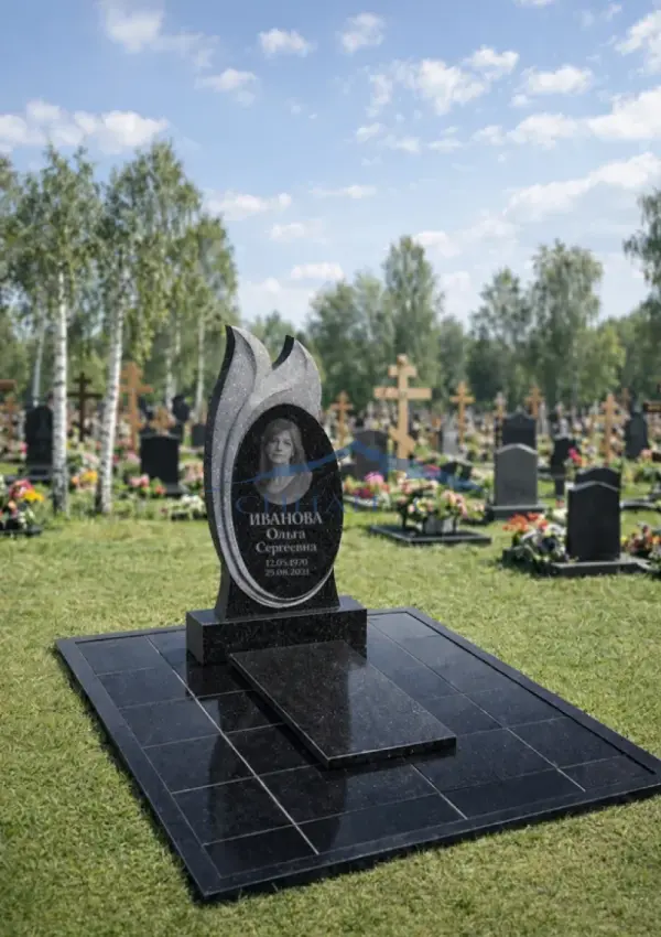 Гранитный памятник «Мемориальная гарантия» выполнен в оригинальной форме с овальной центральной частью из чёрного полированного гранита. Боковой элемент светлого оттенка создаёт плавный динамичный силуэт и подчёркивает глубину композиции. Контраст фактур придаёт модели выразительность и современный характер. Лицевая поверхность предназначена для размещения портрета, имён и памятных дат. Возможна индивидуальная гравировка и дополнительное оформление по желанию заказчика.
