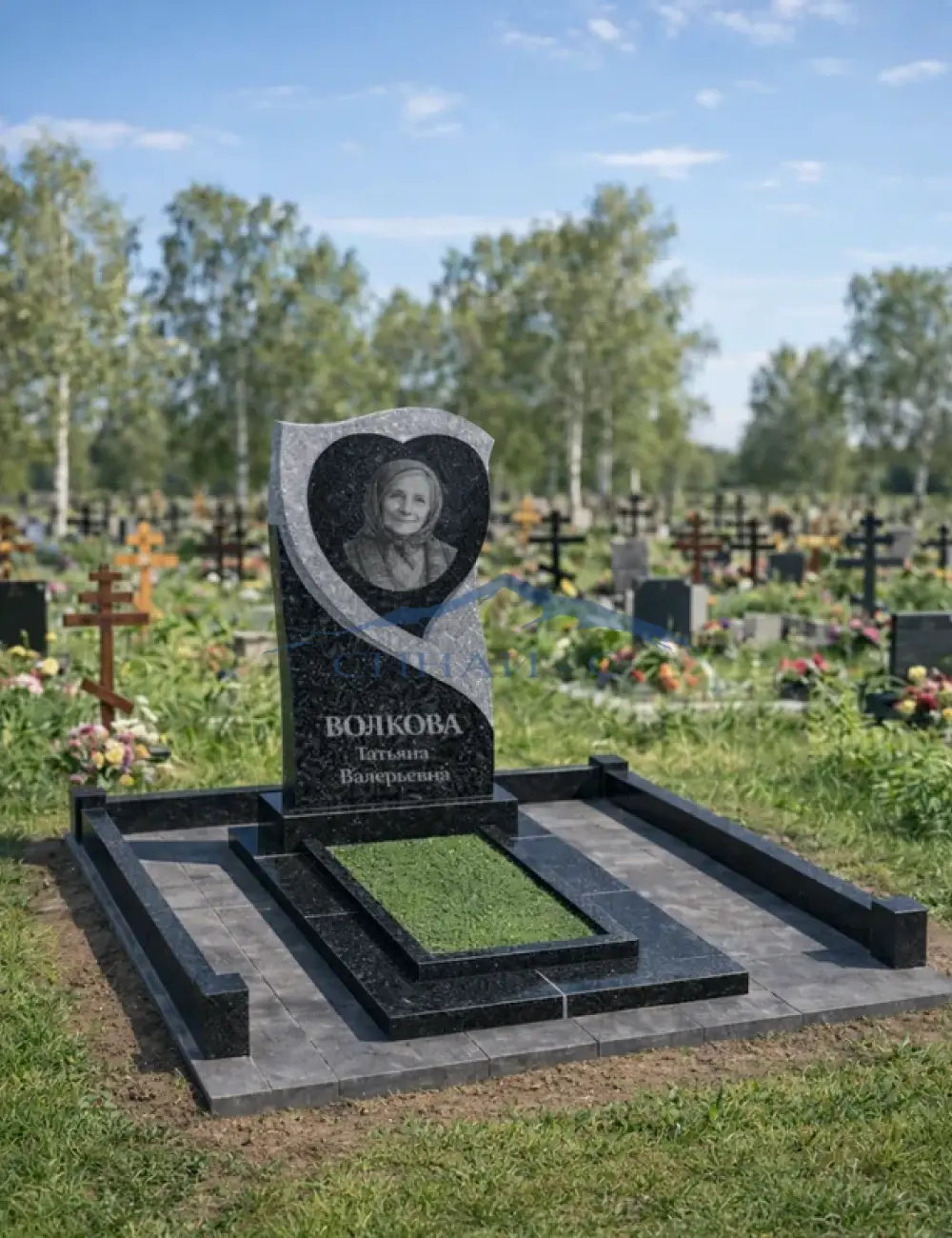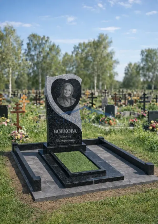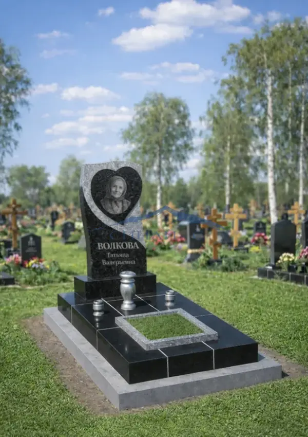 Гранитный памятник «Мирано» выполнен в строгой вертикальной форме из чёрного полированного гранита. Верхняя часть композиции дополнена сердцем, плавно обрамлённым светлым контрастным элементом, создающим выразительный диагональный акцент. Сочетание тёмной поверхности и светлой вставки придаёт модели современный и аккуратный вид. Гладкая лицевая часть подходит для размещения портрета, имён и памятных дат. Возможна индивидуальная гравировка по желанию заказчика.