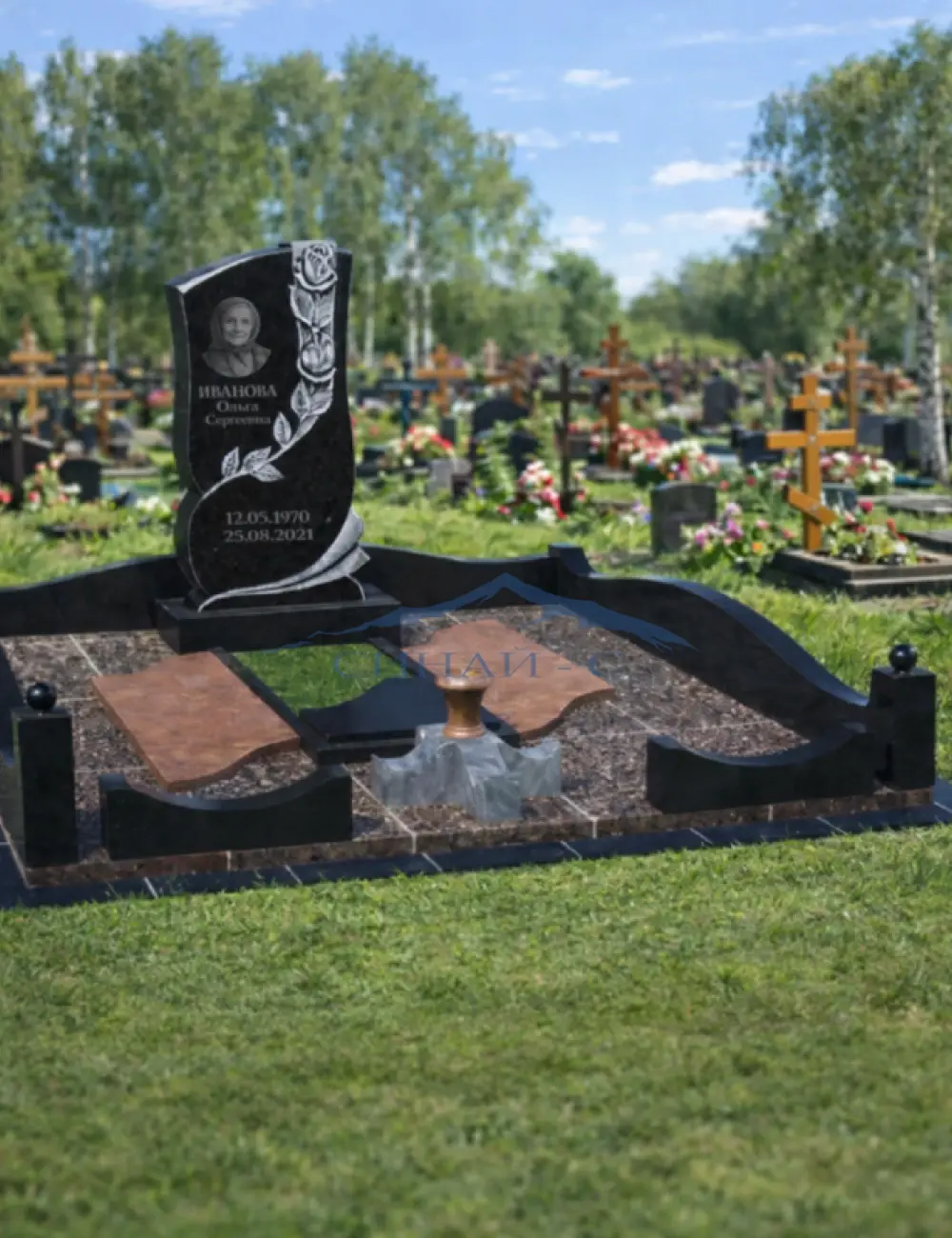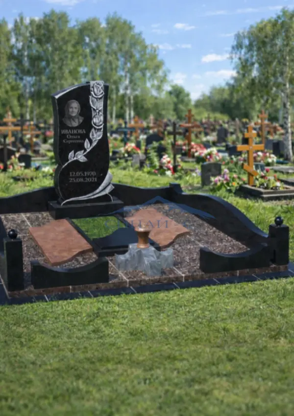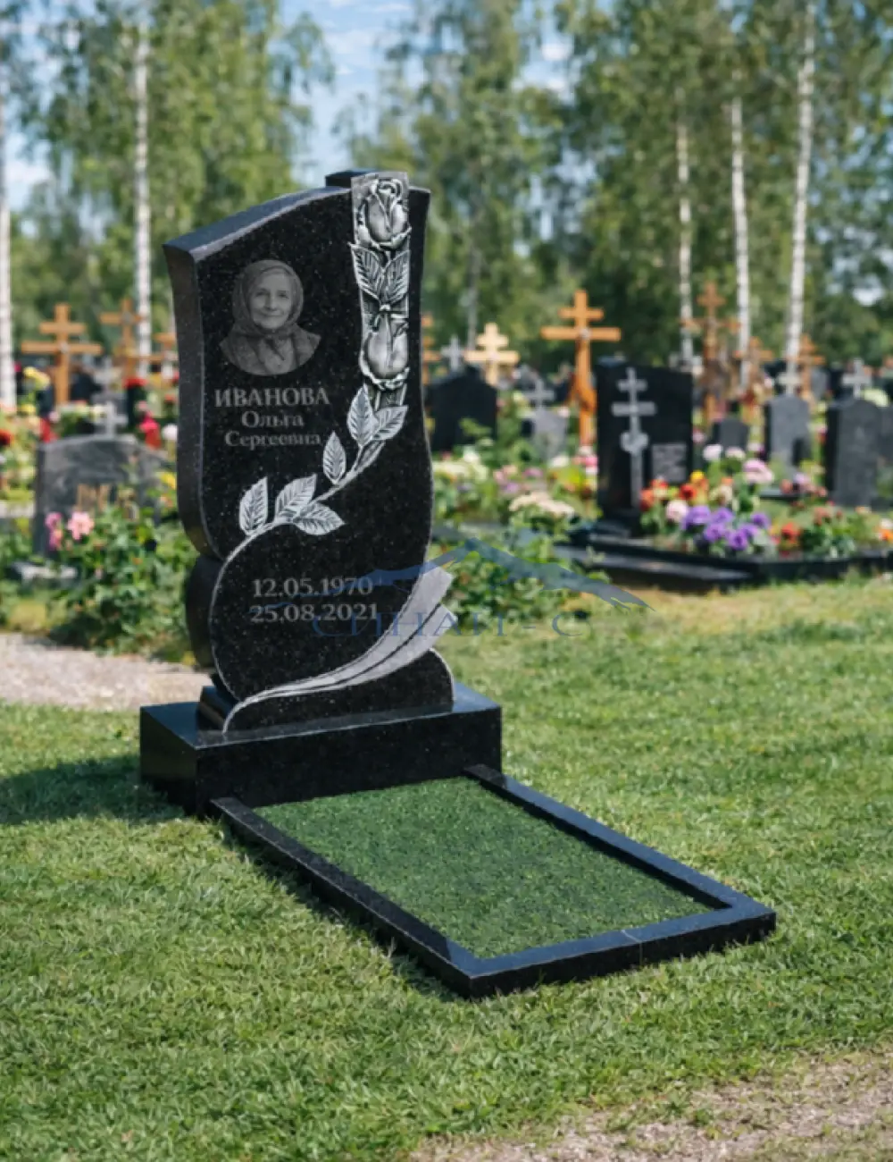 Гранитный памятник с розой выполнен в изящной волнообразной форме из прочного чёрного гранита. Фигурная стела украшена резной ветвью розы, расположенной вдоль боковой части композиции. Детально проработанные лепестки и листья создают выразительный контраст с полированной поверхностью камня. Плавные линии подчёркивают утончённость модели и придают памятнику особую гармонию. Возможна гравировка портрета, надписей и дат, что позволяет создать индивидуальный мемориал.