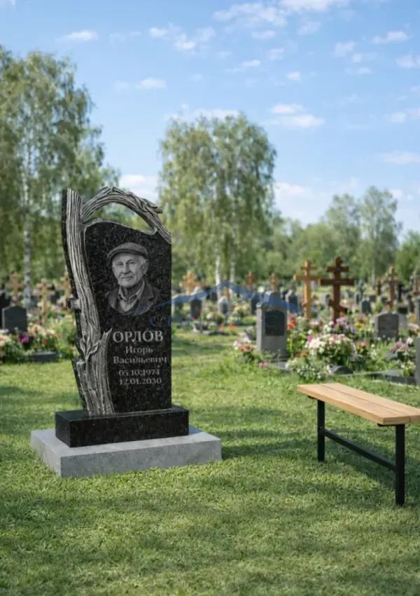 Гранитный памятник «Дерево» выполнен из чёрного и светлого гранита и отличается выразительным художественным оформлением. Центральную часть композиции составляет стела из чёрного гранита, которую обрамляет декоративный элемент в виде ствола и ветвей дерева, выполненный из светлого гранита. Такой дизайн символизирует связь поколений, память и продолжение жизни. Полированная поверхность камня позволяет аккуратно нанести гравировку портрета, фамилии, имени, дат жизни и памятной надписи. Купить гранитный памятник «Дерево» можно в Саратове и Энгельсе с изготовлением и установкой.