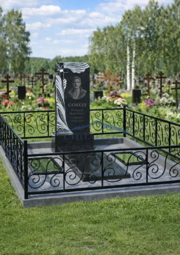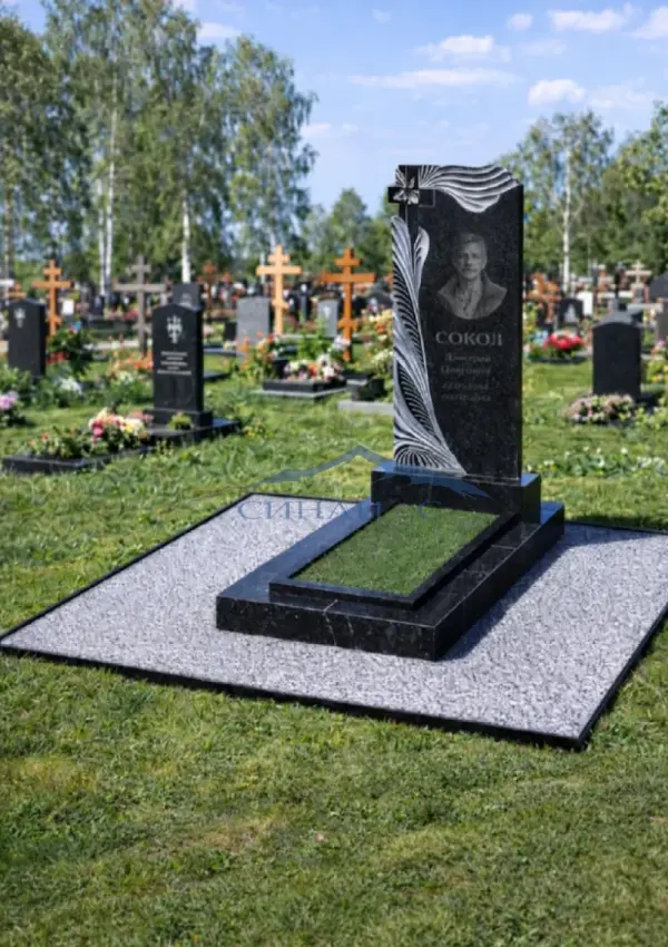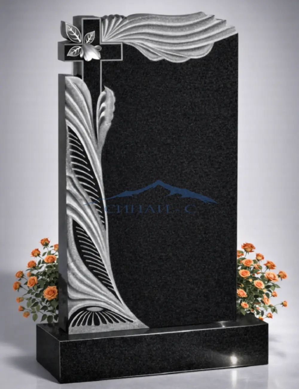 Гранитный памятник с изображением цветка и креста выполнен из прочного черного гранита. Цветок проработанный в мельчайших деталях, символизирует вечную любовь и память о близком человеке. Листья переданные с высокой точностью, придают памятнику элегантный и утонченный вид. Крест в верхней части памятника подчеркивает его духовное значение. Возможно добавление гравировки, что позволяет персонализировать памятник, добавив важные даты, имена или другие символы. Комплект включает в себя вертикальную гранитную стелу (2-хсторонняя полировка) и гранитный постамент.