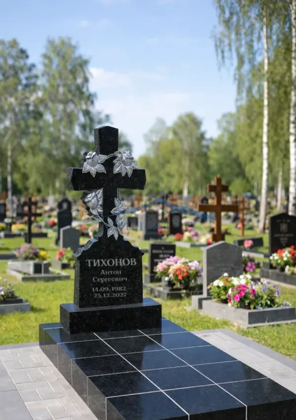 Гранитный памятник «Крест‑14» изготовлен из прочного черного гранита премиального качества, что обеспечивает долговечность и стойкость к внешним воздействиям. Верхняя часть композиции выполнена в виде классического креста, украшенного художественно проработанными розами, символизирующими чистоту чувств, память и вечную любовь. Детальная резьба на цветах и листьях придает памятнику выразительность и глубину визуального восприятия. Благородная полированная поверхность сохраняет насыщенный цвет и эстетичный вид на долгие годы. Возможна персонализированная гравировка с именем, датами, надписями или памятными символами, что делает изделие уникальным и соответствующим индивидуальным пожеланиям заказчика.