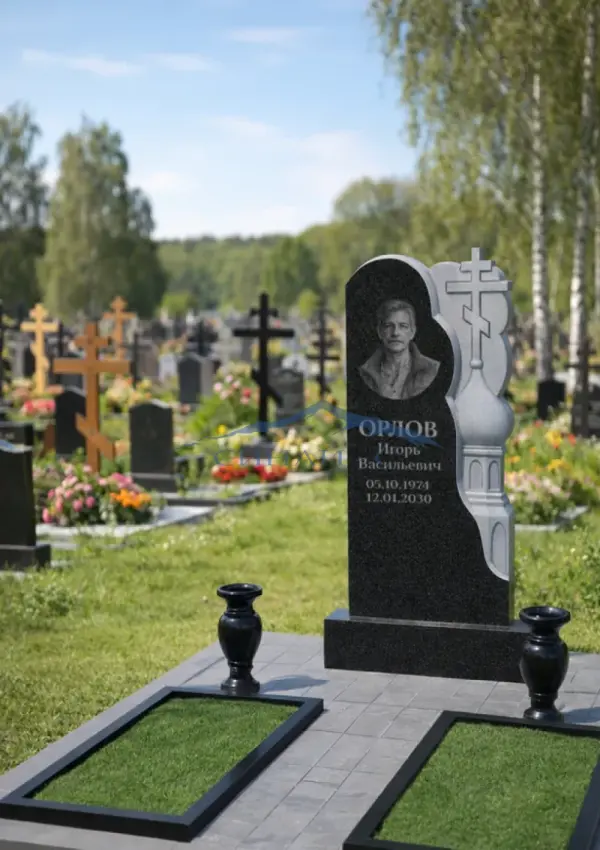 Гранитный памятник «Небесная лазурь» изготовлен из прочного высококачественного черного гранита, обеспечивающего долговечность, стойкость к атмосферным воздействиям и благородный визуальный эффект. Элегантная стела украшена художественным изображением купола и православного креста, что символизирует духовную связь, светлую память и надежду на вечную жизнь. Плавные линии памятника и контраст между полированной поверхностью и рельефной резьбой создают глубокую выразительность и торжественный образ. Отшлифованная гранитная поверхность служит превосходной основой для нанесения портрета, имён, дат и памятных надписей, а гармоничный дизайн делает модель универсальной для установки на одиночном или семейном месте захоронения. Возможна индивидуальная гравировка с именами, датами и символами, что делает памятник уникальным выражением уважения, любви и памяти о близком человеке.