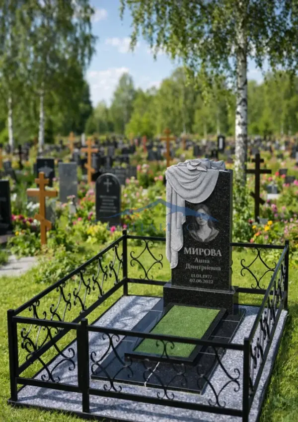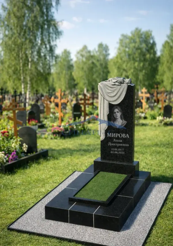 Гранитный памятник «Светлый мотив» изготовлен из прочного и долговечного высококачественного черного гранита, обеспечивающего стойкость к атмосферным воздействиям и благородный визуальный эффект. Верхнюю часть стелы украшает художественный рельефный мотив, напоминающий воздушную ткань и цветочный узор, что символизирует светлую память, любовь и уважение к усопшему. Плавные линии и контуры памятника создают мягкий, спокойный образ, подчёркивая торжественность и эмоциональную глубину композиции. Отполированная поверхность служит превосходной основой для размещения портрета, имён, дат и памятных надписей, отражая индивидуальность и память о родном человеке. Такая модель универсальна, подходит как для одиночных, так и для семейных захоронений. Возможна индивидуальная гравировка с именами, датами, эпитафиями или символами, что делает памятник уникальным и проникновенным выражением любви, памяти и почтения.
