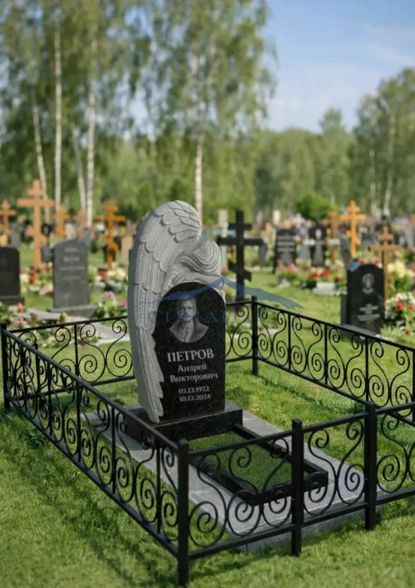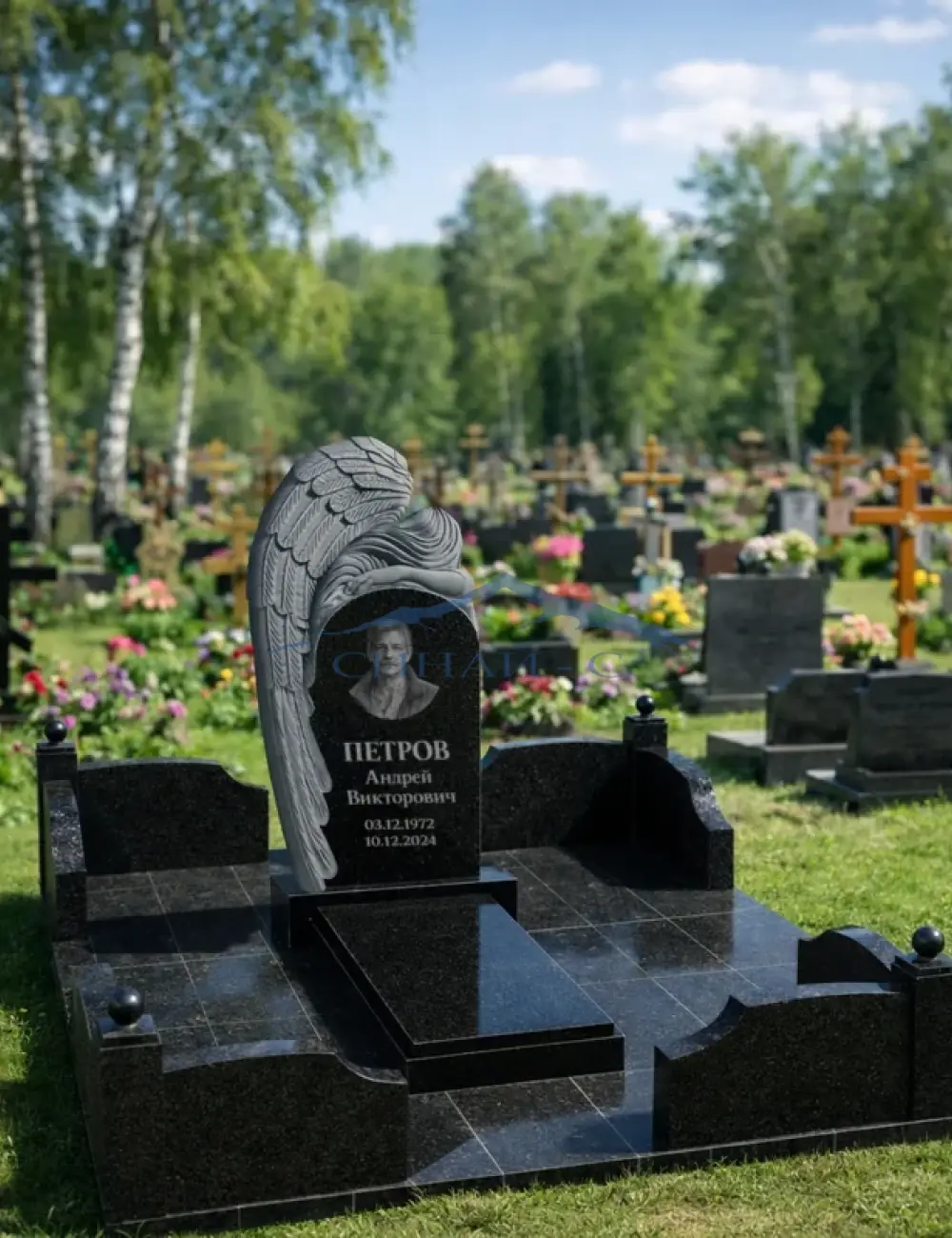 Гранитный памятник «Тебя нет с нами» выполнен из высококачественного прочного черного гранита, который отличается долговечностью, стойкостью к атмосферным воздействиям и благородным визуальным эффектом. Эта модель привлекает внимание выразительной скульптурной композицией: фигурой ангела, опустившего голову в знак глубокой скорби и вечной памяти. Изящно проработанные крылья и плавные линии образа придают памятнику эмоциональную глубину, символизируя любовь, утрату и светлую память о дорогом человеке, который навсегда остался в сердцах. Отшлифованная поверхность служит идеальной основой для нанесения портрета, имён, дат и памятных надписей, подчёркивая торжественность и уважение к усопшему. Памятник подходит как для одиночного, так и для семейного захоронения, а возможность индивидуальной гравировки делает изделие уникальным отражением памяти, любви и благодарности.