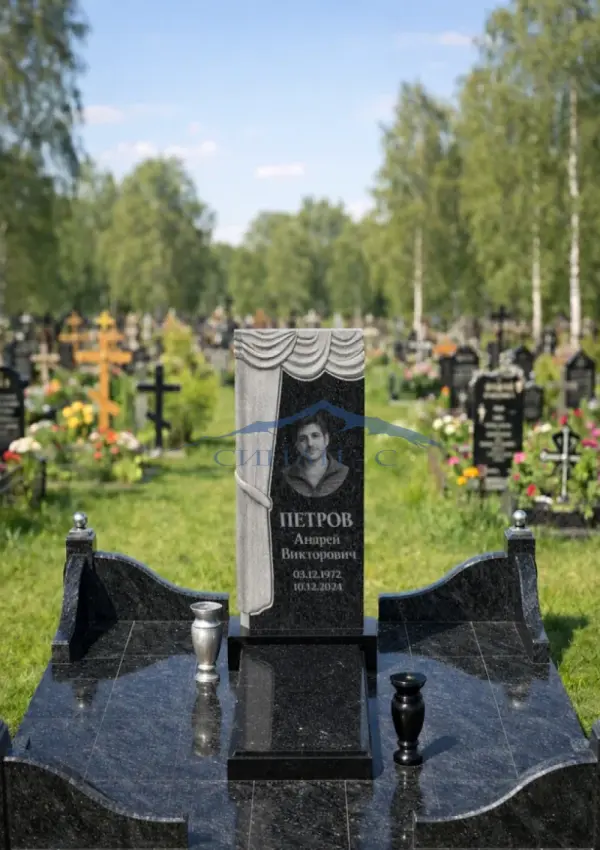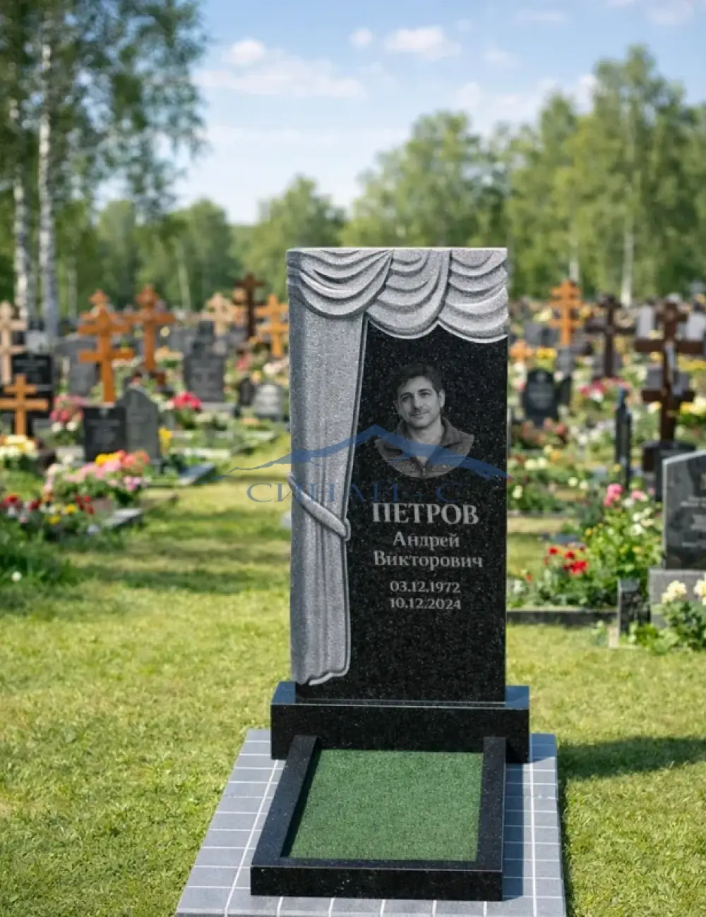 Гранитный памятник «Занавес» изготовлен из прочного высококачественного черного гранита, который отличается долговечностью, стойкостью к внешним воздействиям и благородным внешним видом. Верхняя часть памятника украшена художественной рельефной драпировкой, словно занавесом, символизирующей тонкую грань между миром земным и вечным, память и уважение к ушедшему. Контраст между глубоко отполированной поверхностью и текстурной резьбой создаёт выразительность и эстетическую глубину композиции. Лаконичная форма идеально подходит для нанесения портрета, имён, дат и памятных надписей, подчёркивая индивидуальность изделия. Такая модель прекрасно смотрится как на одиночных, так и семейных захоронениях. Возможна индивидуальная гравировка с именами, датами, эпитафиями или памятными символами, что делает памятник уникальным отражением любви, памяти и глубокого уважения к усопшему.