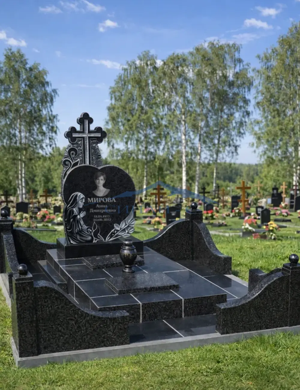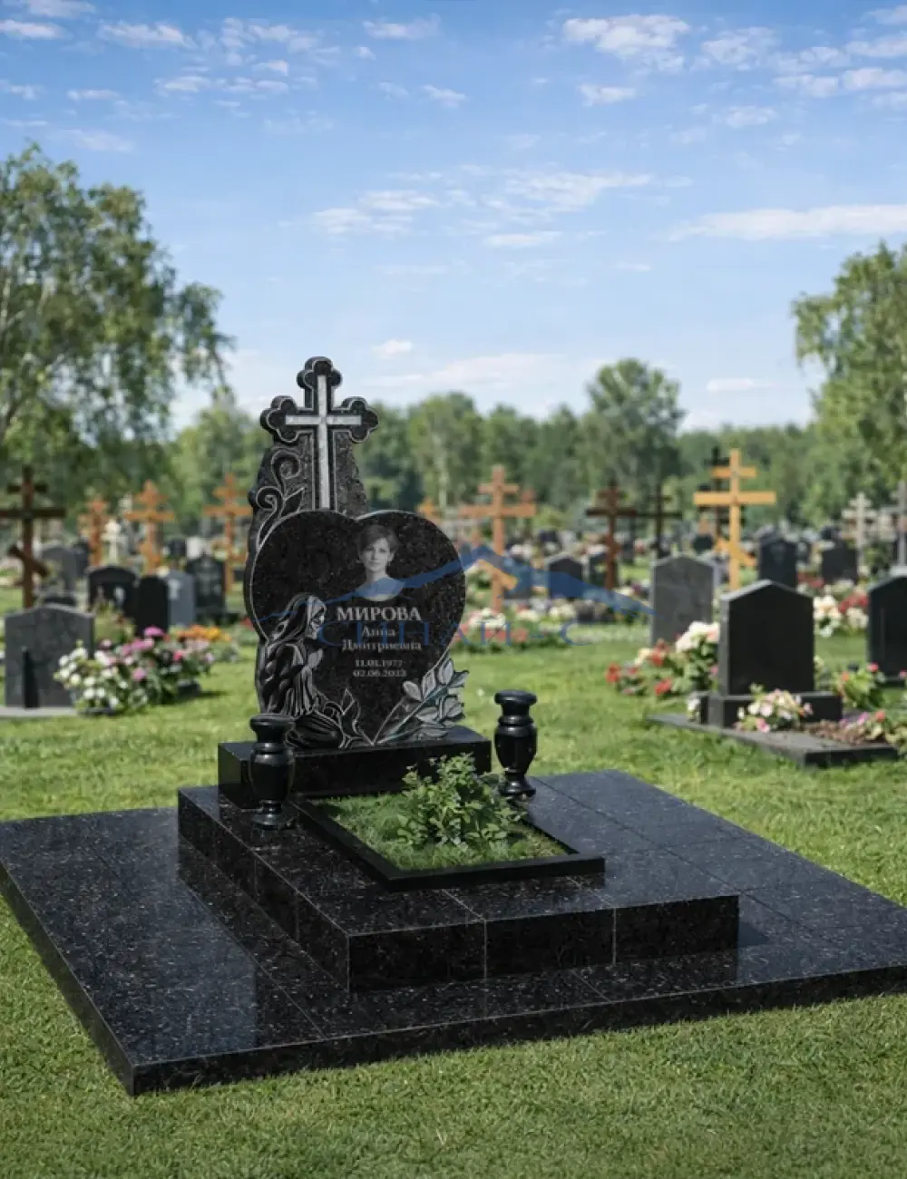 Гранитный памятник «Молитва» выполнен в выразительной композиции с сердцевидной стелой из полированного чёрного гранита. В верхней части размещён православный крест, ниже — фигура молящейся женщины, выполненная в светлом камне. Справа композицию дополняют розы и растительный орнамент. Контраст тёмной основы и светлых декоративных элементов подчёркивает чёткость линий и аккуратность обработки.
