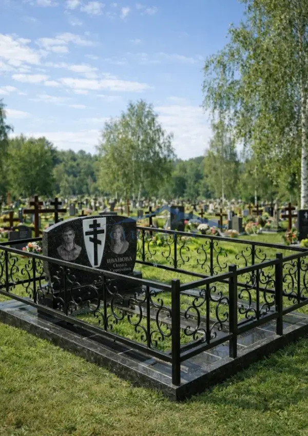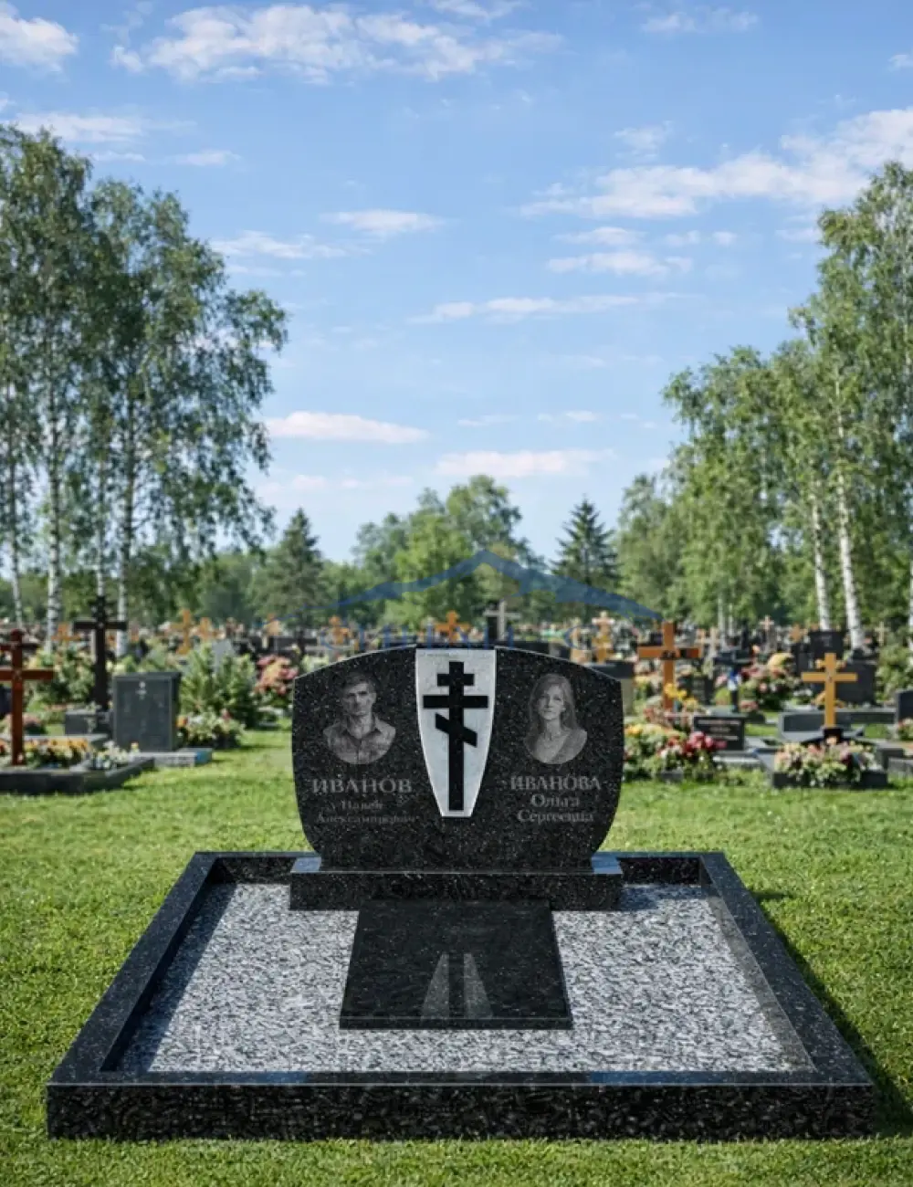 Гранитный памятник «Крест в центре» выполнен в горизонтальной форме из чёрного полированного гранита. Центральную часть композиции выделяет светлая вставка со стилизованным православным крестом, создающая выразительный визуальный акцент. Плавная линия верха придаёт стеле гармоничный силуэт и подчёркивает строгий характер модели. Просторная лицевая поверхность предназначена для размещения портретов, имён и памятных дат. Подходит для двойного захоронения. Возможна индивидуальная гравировка.