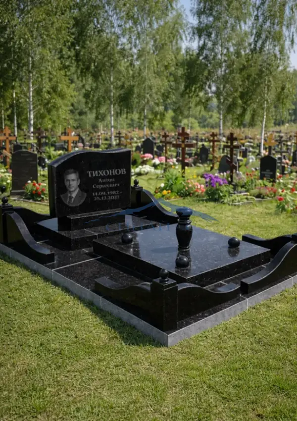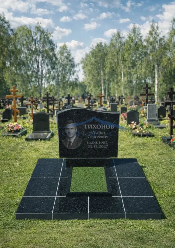 Гранитный памятник выполнен в горизонтальном формате с мягкой волнообразной линией верхнего края. Лаконичная форма подчёркивает строгость и сдержанность композиции, а полированная поверхность чёрного гранита придаёт изделию глубину и благородный блеск. Прочная стела установлена на устойчивом основании, что обеспечивает надёжность конструкции. Памятник подходит для двойного захоронения и позволяет разместить портреты, имена, даты и памятные надписи, сохраняя гармоничный и аккуратный внешний вид.