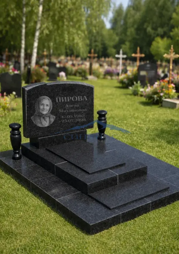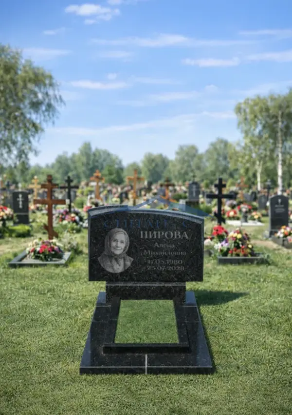 Гранитный памятник «Вечный покой» выполнен в горизонтальной форме из чёрного полированного гранита. Плавная линия верха придаёт стеле мягкий и завершённый силуэт, сохраняя строгий мемориальный характер. Гладкая поверхность камня подчёркивает глубину цвета и обеспечивает удобство нанесения портрета, имён и памятных дат. Лаконичный дизайн делает модель универсальным решением для благоустройства места захоронения. Подходит для двойного захоронения. Возможна индивидуальная гравировка.