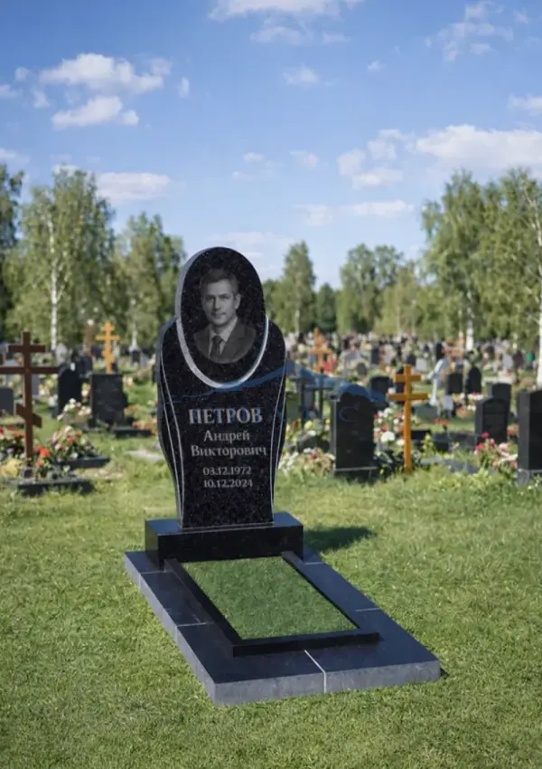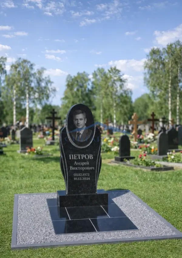 Гранитный памятник «Мир камня» выполнен в лаконичной вертикальной форме из чёрного полированного гранита. Центральную часть украшает овальная область, выделенная светлой окантовкой, что придаёт композиции аккуратность и выразительность. Плавные боковые линии создают гармоничный силуэт и подчёркивают строгий стиль модели. Поверхность камня тщательно отполирована, что усиливает глубину цвета. Возможна гравировка портрета, имён, дат и памятных надписей по индивидуальному заказу.