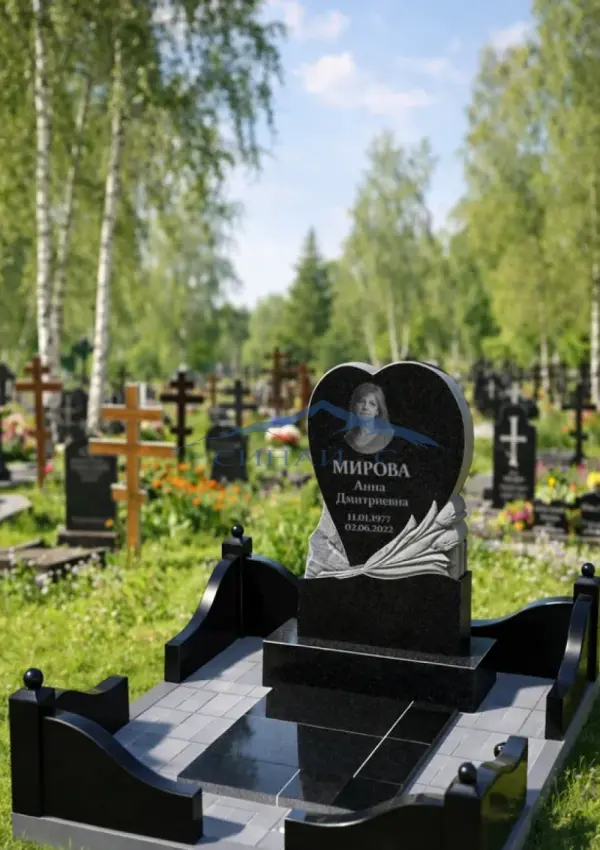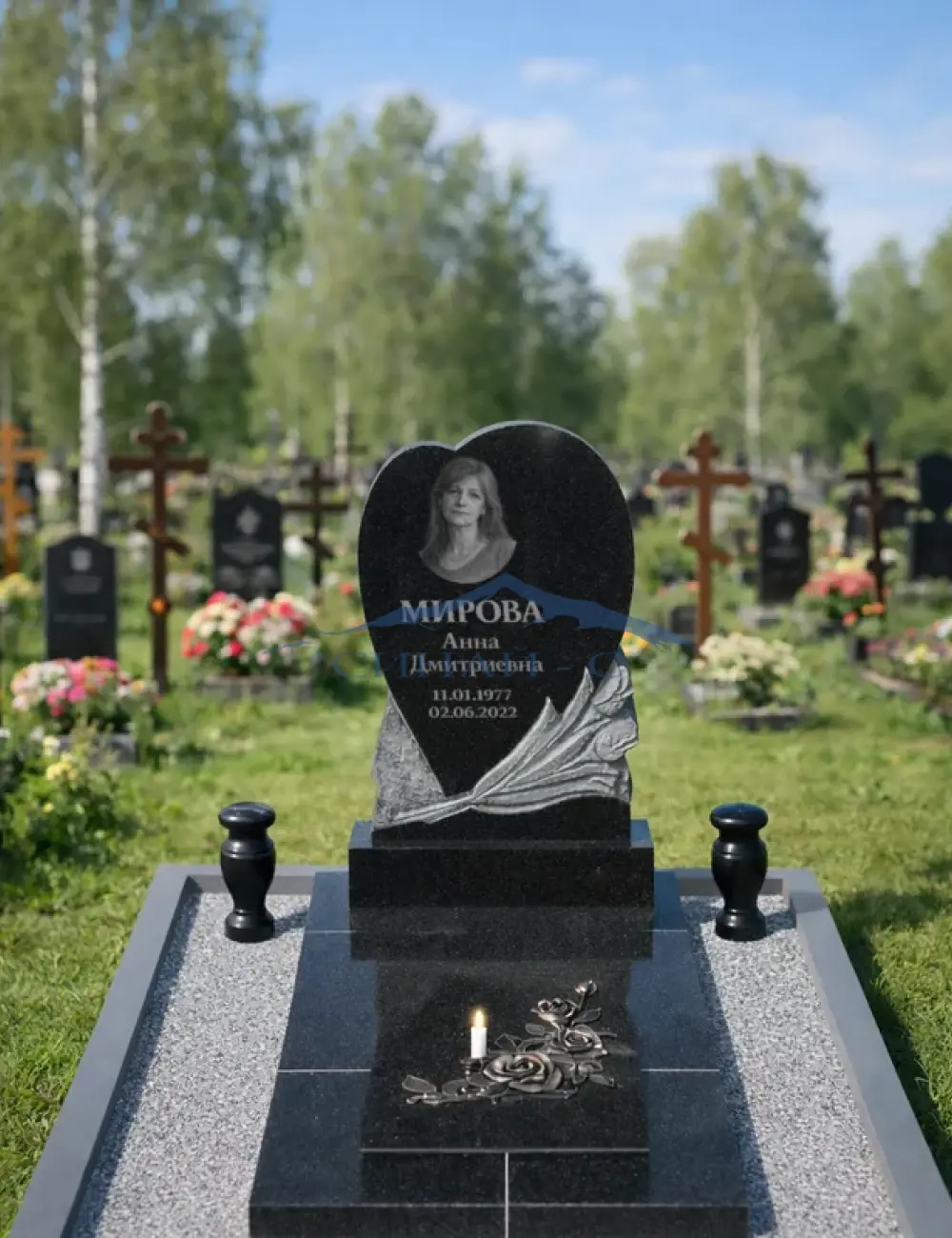 Гранитный памятник «Осиротевшие сердца» выполнен из высококачественного прочного черного гранита, обеспечивающего долговечность, стойкость к атмосферным воздействиям и эстетическую выразительность. Верхняя часть памятника оформлена в виде двух переплетённых сердец, символизирующих нерушимую связь, любовь и светлую память о дорогих людях, чьи сердца навсегда остались вместе. Художественно выполненная композиция передаёт глубокие эмоции, уважение и тоску, делая изделие особенно трогательным. Плавные линии и тщательно отполированная поверхность создают благородный визуальный эффект, подчёркивая торжественность памятного образа. Поверхность памятника служит превосходной основой для портрета, имен, дат и памятных надписей. Возможна индивидуальная гравировка, что делает памятник уникальным отражением любви, уважения и бесконечной памяти о родных.