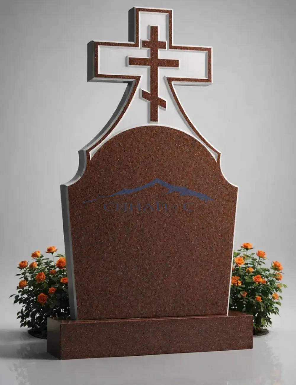Гранитный памятник с православным крестом выполнен из прочного красного гранита с выразительной природной текстурой. Композиция дополнена светлыми декоративными вставками, которые подчеркивают форму креста и придают памятнику выразительность и глубину. Крест символизирует веру, духовную защиту и вечную память о близком человеке. Плавные линии стелы гармонично сочетаются с геометрией креста, создавая строгий и благородный образ. Контраст материалов усиливает визуальный эффект и делает памятник более заметным. Возможна гравировка, позволяющая персонализировать памятник именами, датами или изображениями.