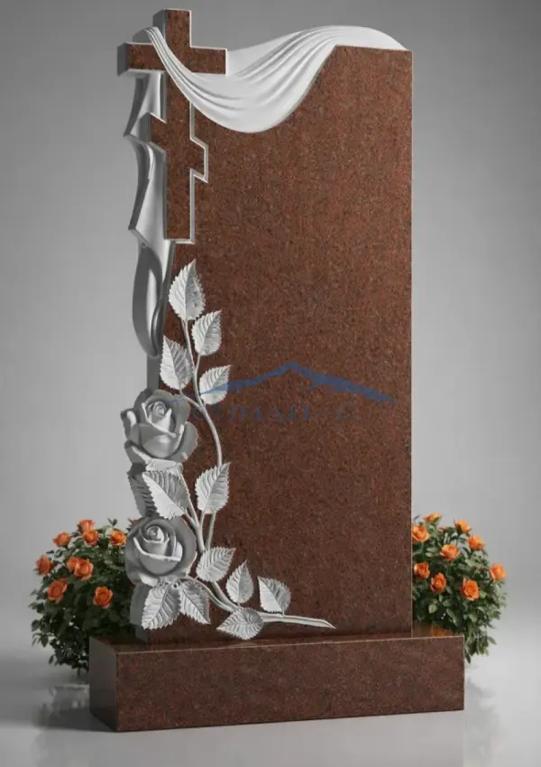 Гранитный памятник с крестом, драпировкой и розами изготовлен из высококачественного красного гранита. Прямая форма стелы придает изделию строгость и монументальность. В верхней части расположен православный крест, дополненный художественной резьбой в виде ниспадающей ткани, символизирующей скорбь, прощание и вечную память. Нижняя часть украшена изящным цветочным орнаментом с розами и листьями, выполненными с тонкой детализацией, олицетворяющими любовь и уважение к ушедшему человеку. Контраст теплого оттенка гранита и светлого рельефа подчеркивает выразительность композиции. Возможна гравировка имен, дат или изображений для индивидуального оформления.